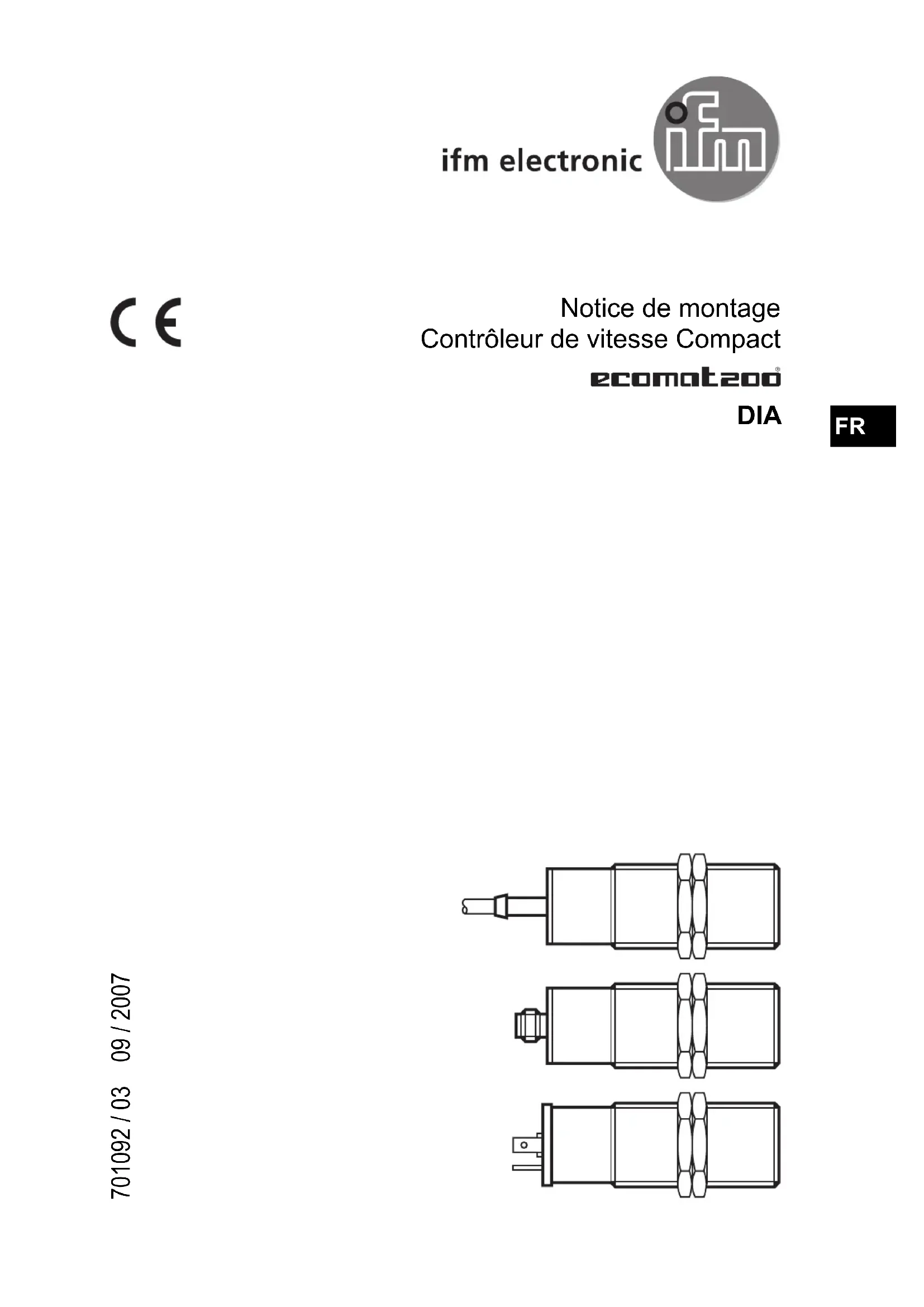 FR2 1 Fonctionnement et caractéristiques Le contrôleur de vitesse de rotation Compact détecte sans contact si une vitesse de rotation minimum est atteinte et signale la sous-vitesse par un signal de commutation. Portée nominale (Sn) 10 mm ; valeur de consigne réglable, voir l'étiquette. 2 Montage