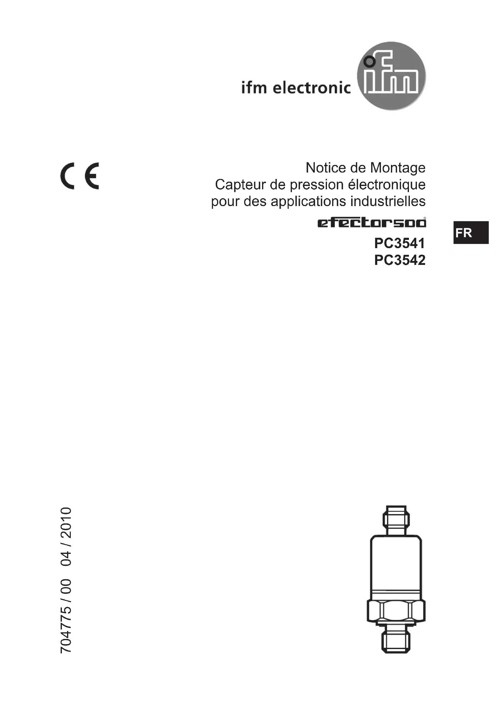 - Notice de Montage Capteur de pression électronique pour des applications industrielles PC3541 PC3542 704775 / 00 04 / 2010 FR2 1 Consignes de sécurité Avant la mise en service de l’appareil, lire ce document. S’assurer que le • produit est approprié pour l’application concernée sans aucune restriction d’utilisation. Le non-respect des consignes ou des données techniques peut provoquer des • dommages matériels et/ou corporels. Pour toutes les applications veuillez vérifier la compatibilité des matières du • produit (voir données techniques) avec les fluides sous pression à mesurer. Dans le champ d‘application cULus : L‘appareil doit être impérativement alimenté par une alimentation isolée galva- niquement disposant au secondaire d‘un fusible avec homologation UL et un courant nominal max. de a) 5 ampères pour des tensions de 0 p. 20