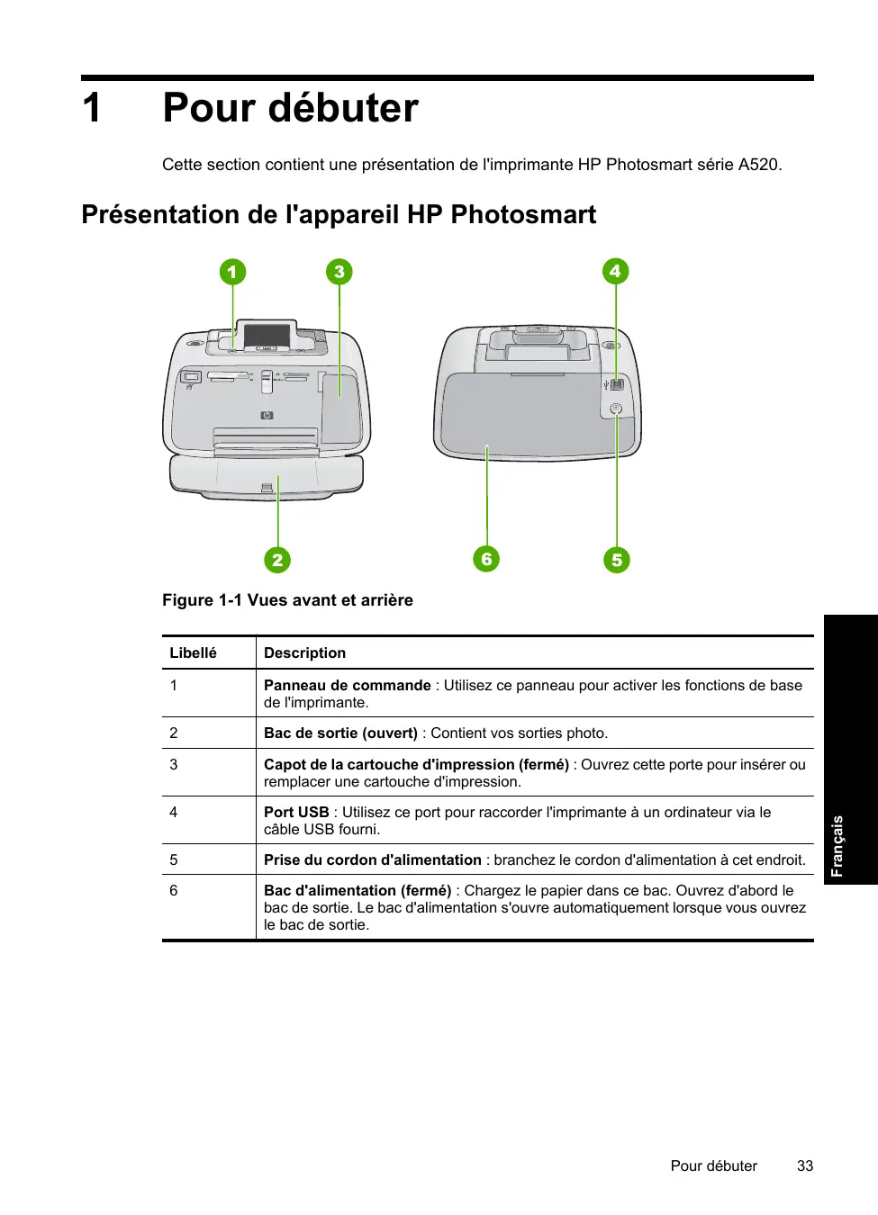 Cette section contient une présentation de l'imprimante HP Photosmart série A520.