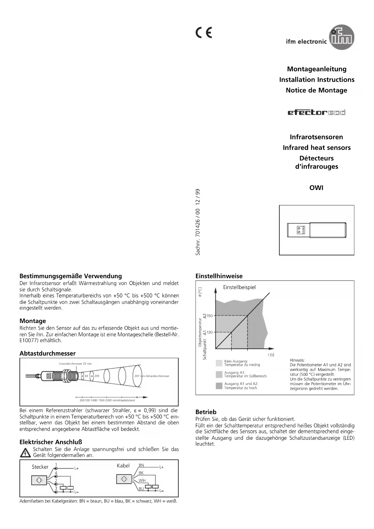 Einstellbeispiel Schaltpunkt A1 A2Function and features Infrared heat sensors absorb the heat radiation of objects and convert it into switching signals. Within a temperature range of +50 °C to +500 °C the switch points of two switching outputs can be set independently. Installation Align the sensor towards the object to be detected and mount it. A special mounting clamp is available as accessory (order no. E10077) for simple mounting. Detection diameter With a reference emitter (black emitter, ε = 0.99) the switch points can be set within a temperature range of +50 °C to +500 °C when the object completely covers the detection area indicated above at a defined distance. Electrical connection Disconnect power, then connect the unit according to the wiring diagram. Core colours of cable units: BN = brown, BU = blue, BK = black, WH = white. Fonctionnement et caractéristiques Les détecteurs d'infrarouges détectent le rayonnement thermique d'un objet et le convertissent en signaux de commutation. Dans une plage de température de +50 °C à +500 °C les seuils des deux sorties de commutation peuvent être réglés independamment. Montage Orienter le détecteur en direction de l'objet à détecter et le monter. Une bride de fixation est disponible en accessoire (référence E10017 et E10019). Diamètre de détection Le seuil de commutation d’un émetteur de référence (émetteur noir, ε = 0,99) peut être réglé dans une plage de température de +50 °C à +500 °C quand l’objet couvre complètement la zone de détection indi- quée à la distance déterminée. Raccordement électrique Mettre l'installation hors tension et raccorder l'appareil selon le schéma de branchement. Couleurs des fils conducteurs: BN = brun, BU = bleu, BK = noir, WH = blanc. Notice de réglage Fonctionnement Vérifier le bon fonctionnement du détecteur. Quand un objet chaud (la chaleur dégagée est conforme à la tempé- rature de commutation) couvre complètement la zone visible du cap- teur la sortie réglée commute et l’indication commutation (LED) cor- respondante est allumée. Setting instructions Operation Check the safe function of the sensor. When a hot object - the heat of which corresponds to the switching temperature - completely covers the visible area of the sensor, the out- put set to this temperature switches and the corresponding switching status indication (LED) is lit. 46 83 144 205267 mm Abtastdurchmesser200 500 1000 1500 2000 mmAbtastabstandLinsendurchmesser 22 mm