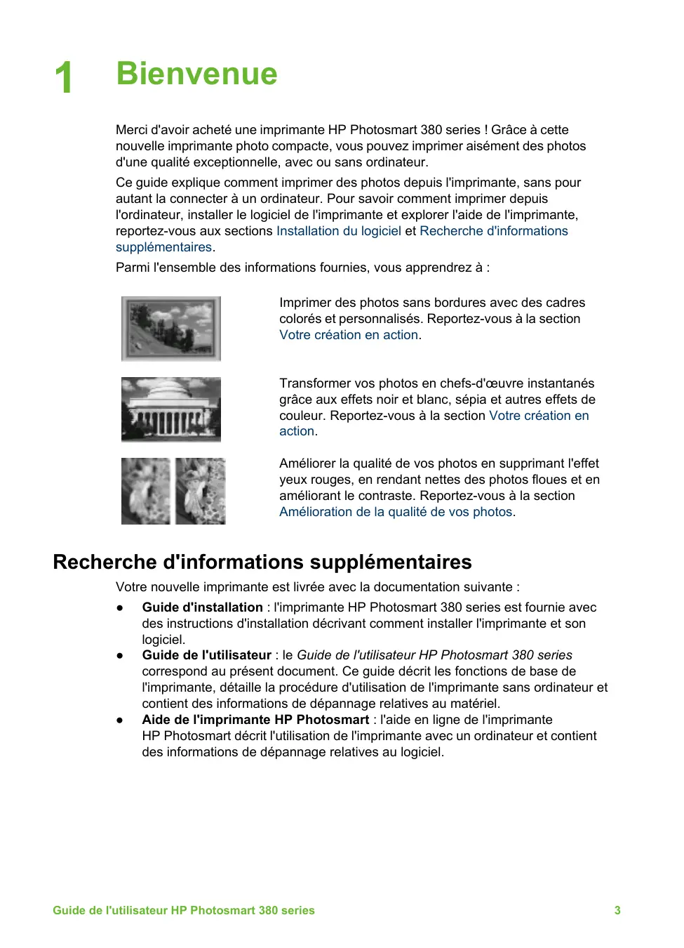 Bienvenue Merci d'avoir acheté une imprimante HP Photosmart 380 series ! Grâce à cette nouvelle imprimante photo compacte, vous pouvez imprimer aisément des photos d'une qualité exceptionnelle, avec ou sans ordinateur. Ce guide explique comment imprimer des photos depuis l'imprimante, sans pour autant la connecter à un ordinateur. Pour savoir comment imprimer depuis l'ordinateur, installer le logiciel de l'imprimante et explorer l'aide de l'imprimante, reportez-vous aux sections Installation du logiciel et Recherche d'informations supplémentaires. Parmi l'ensemble des informations fournies, vous apprendrez à : Imprimer des photos sans bordures avec des cadres colorés et personnalisés. Reportez-vous à la section Votre création en action. Transformer vos photos en chefs-d'œuvre instantanés grâce aux effets noir et blanc, sépia et autres effets de couleur. Reportez-vous à la section Votre création en action. Améliorer la qualité de vos photos en supprimant l'effet yeux rouges, en rendant nettes des photos floues et en améliorant le contraste. Reportez-vous à la section Amélioration de la qualité de vos photos. Recherche d'informations supplémentaires Votre nouvelle imprimante est livrée avec la documentation suivante :