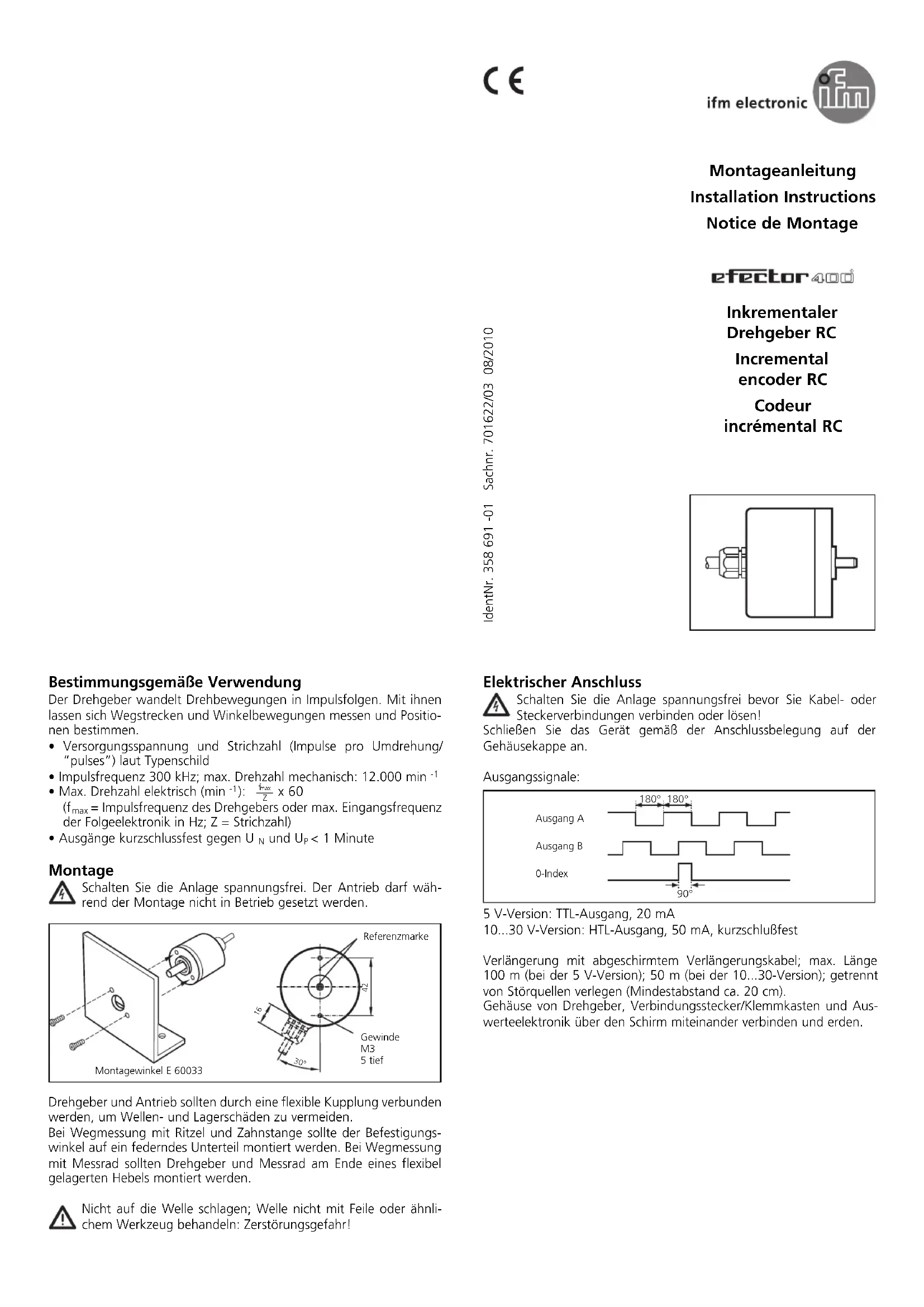 - V); installer séparément des sources parasites (distance minimale env. 20 cm). Relier le boîtier du codeur, le connecteur/le bornier et l’électronique d’exploitation via le blindage et relier à la terre. Electrical connection Disconnect power before connecting or disconnecting the cable or connector. Connect the unit according to the wiring indicated on the housing. Output signals: 5 V version: TTL output, 20 mA 10 p. 30