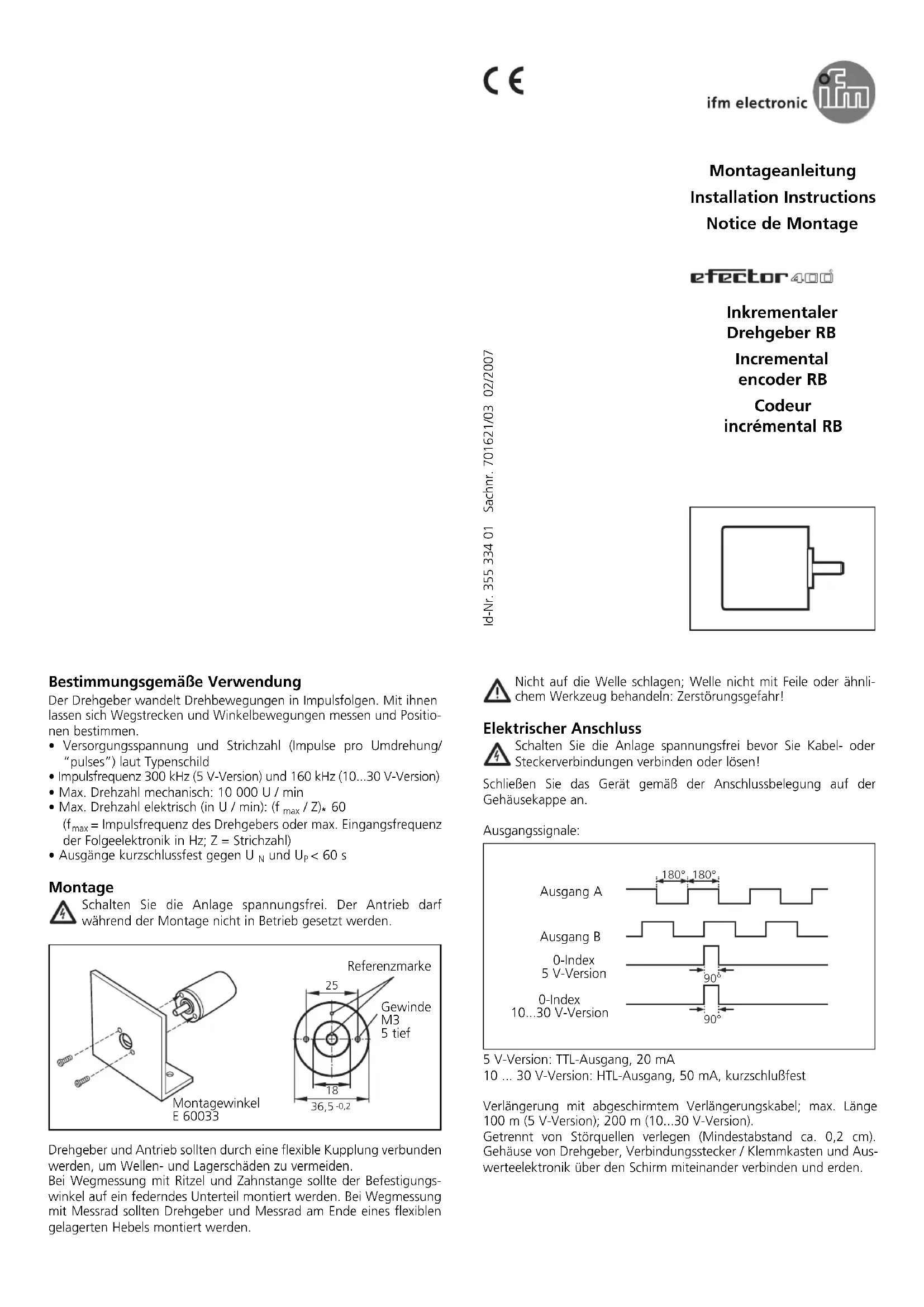 - V); installer séparément des sources parasites (distan- ce min. env. 0,2 m). Relier le boîtier du codeur, le connecteur / le bor- nier et l’électronique d’exploitation via le blindage et relier à la terre. The encoder shaft must not be hit; do not use a file or a similar tool on the shaft, it could destroy the unit. Electrical connection Disconnect power before connecting or disconnecting the cable or connector. Connect the unit according to the wiring indicated on the housing. Output signals: 5 V version = TTL output, 20 mA 10 p. 30