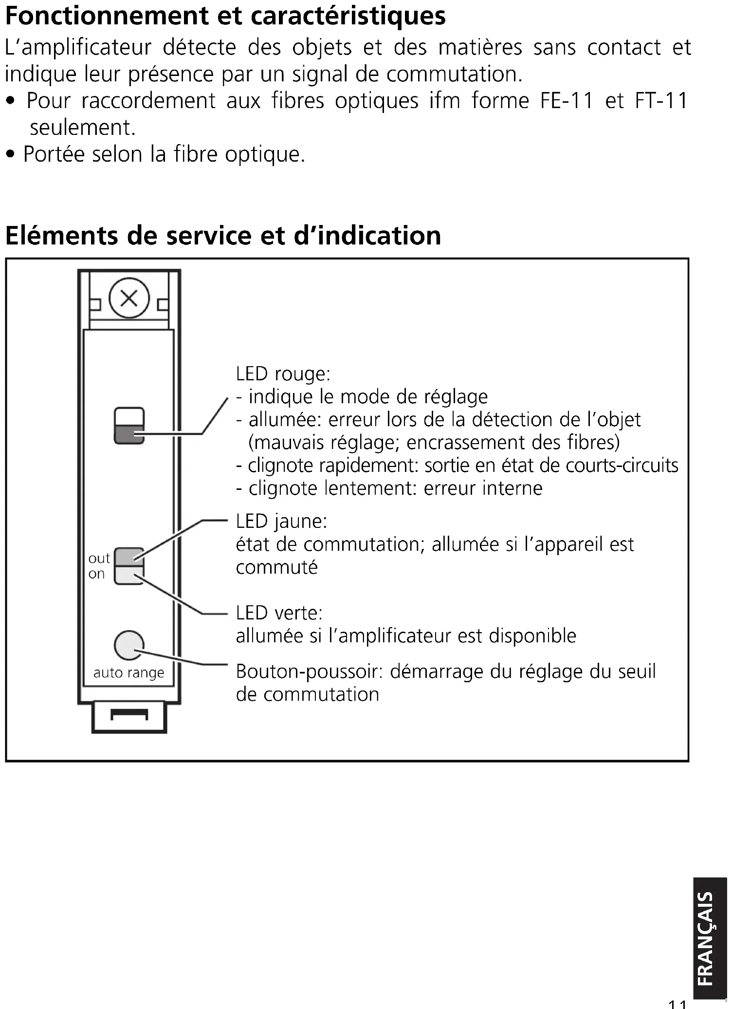 auto range LED rouge: - indique le mode de réglage - allumée: erreur lors de la détection de l’objet (mauvais réglage; encrassement des fibres) - clignote rapidement: sortie en état de courts-circuits - clignote lentement: erreur interne LED jaune: état de commutation; allumée si l’appareil est commuté LED verte: allumée si l’amplificateur est disponible Bouton-poussoir: démarrage du réglage du seuil de commutationMontage Monter l’appareil sur un profilé normalisé (rail DIN) ou à l’aide d’un dis- positif de montage. Monter les fibres optiques comme suit: