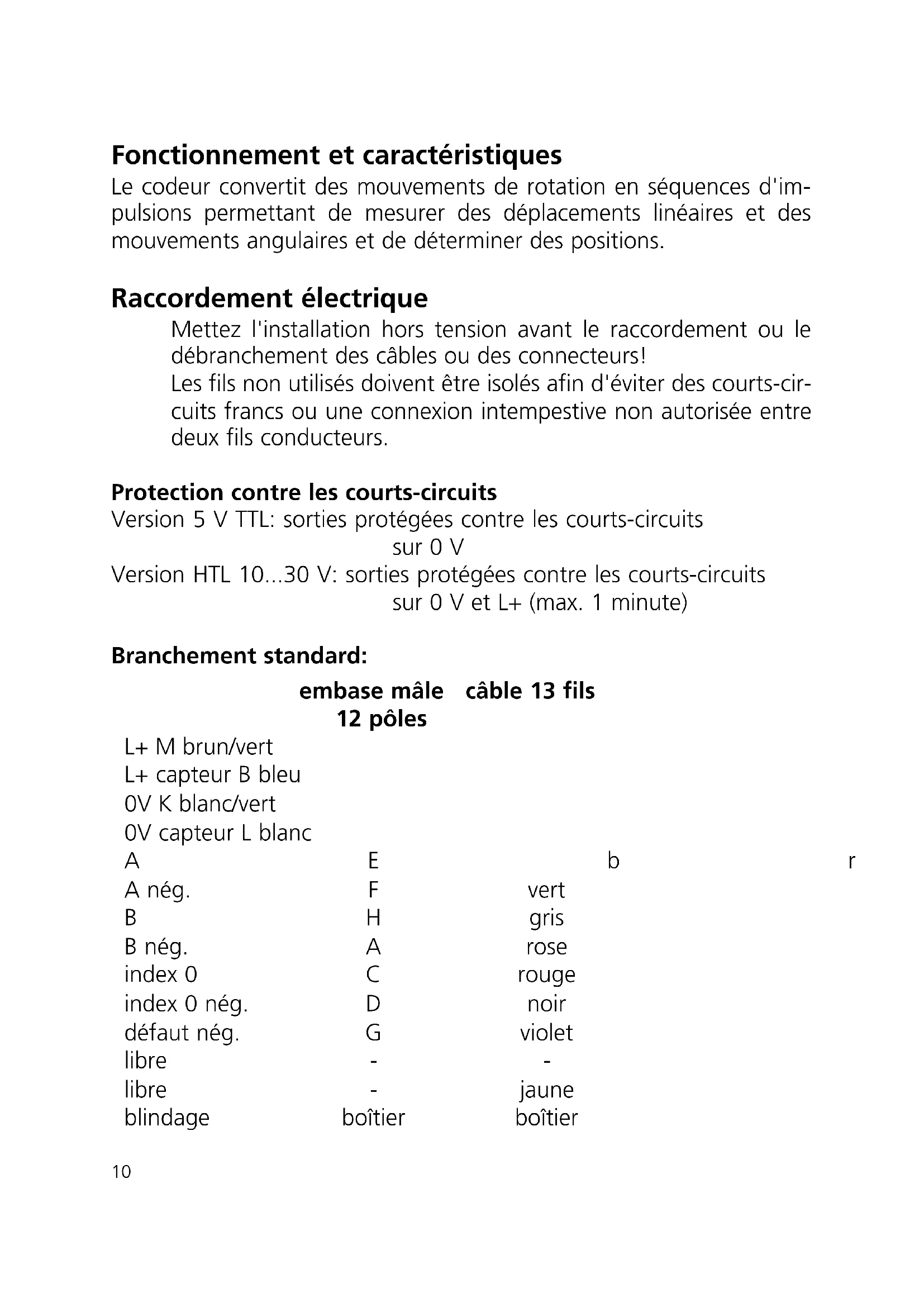 embase mâle câble 13 fils 12 pôles L+ M brun/vert L+ capteur B bleu 0V K blanc/vert 0V capteur L blanc AEbrun A nég. F vert B H gris B nég. A rose index 0 C rouge index 0 nég. D noir défaut nég. G violet libre - - libre - jaune blindage boîtier boîtierVous trouvez également le branchement sur le capot du boîtier. S'il existe un raccordement spécial, le codeur doit être branché comme indiqué sur l'étiquette du boîtier. Les fils L+ (capteur) et 0V (capteur) sont reliés en interne à la tension d'alimentation. Lorsque des modules électroniques régulant la tension d'alimentation sont utilisés, ces fils peuvent servir de fils de test. En cas de non-utilisation ces fils doivent être reliés à la tension d'alimentation ou être isolés. En fonction de la version, le raccordement électrique se fait par le câble ou par des câbles à se procurer séparément. Lorsque des câbles appropriés sont utilisés, la longueur maximale du câble est de 100 m pour la version 5 V TTL et de 300 m pour la ver- sion 10...30 V HTL. Les câbles doivent être installés séparément des sources parasites, la distance minimale étant de 20 cm. Le blindage tressé dans le câble est relié au boîtier du codeur. Signaux de sortie Le codeur fournit des séquences d'impulsions numériques sur les étages de sortie. Les sorties A et B sont électriquement déphasées de 90°, de ce fait le sens de rotation peut être évalué dans le module électronique.