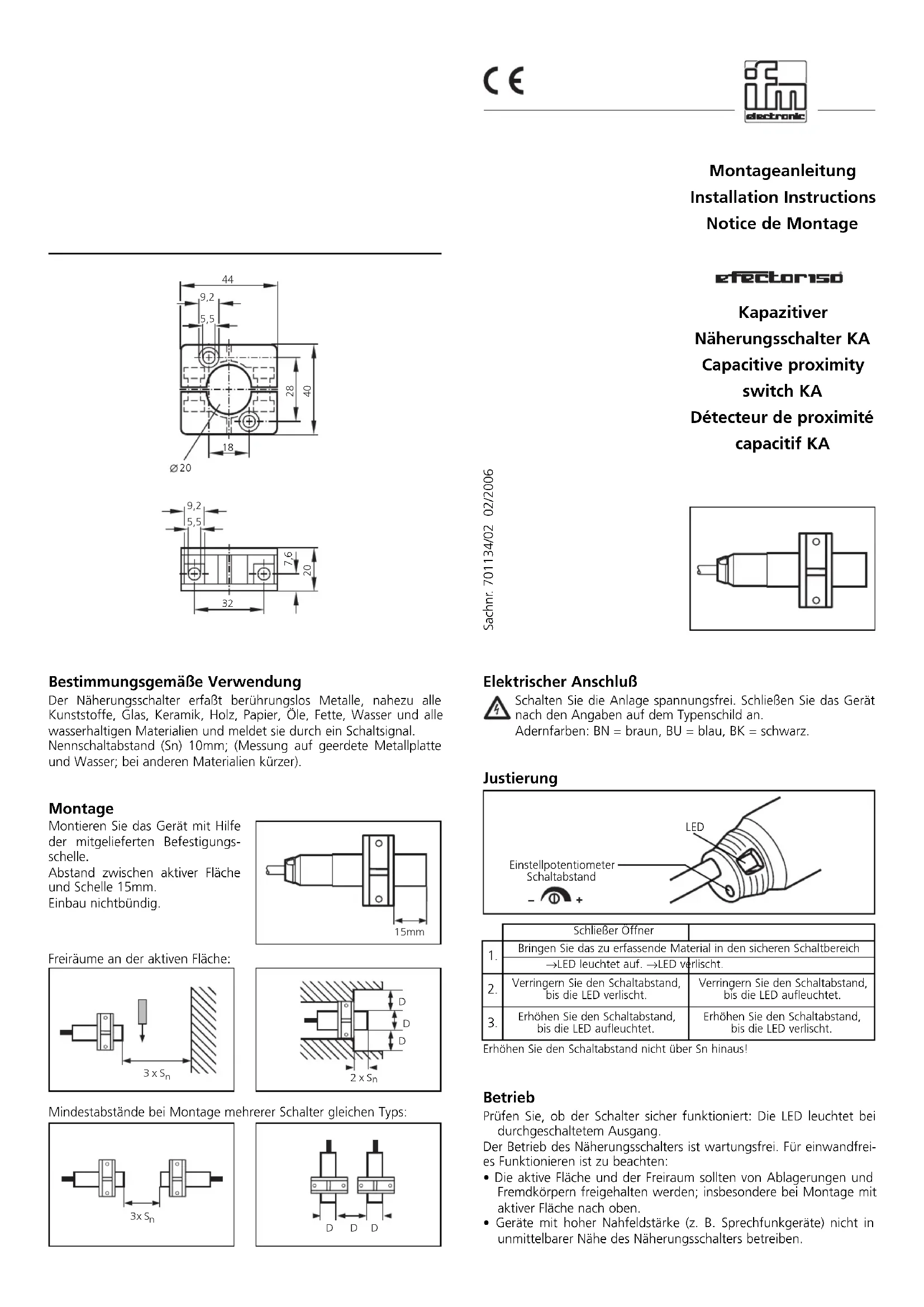 7,6 5,5 9,2 Sachnr. 701134/02 02/2006Function and features This proximity switch detects metals, almost all plastics, glass, ceram- ics, wood, paper, oils, greases, water and all hydrous materials without contact and indicates their presence by providing a switched signal. Nominal sensing range (Sn) 8 mm (measured on on an earthed metal plate and water; a shorter sensing range for other materials). Installation Mount the proximity switch by means of the mounting bracket provided. Distance between sensing face and bracket 15mm. Non-flush installation. Open space around the sensing face: Minimum distance when several switches of the same type are mounted: Fonctionnement et caractéristiques Ce détecteur de proximité détecte les métaux, presque tous les pla- stiques, le verre, la céramique, le bois, le papier, les huiles, les graisses, l’eau et tous les matériaux aqueux sans contact et indique leur pré- sence par un signal de commutation. Portée nominale (Sn) 8 mm (mesurée sur une plaque mise à la terre ou sur l’eau; en cas d’autres matériaux portée inférieure à 8 mm). Montage Monter le détecteur de proximité avec l’équerre de fixation livrée. Distance entre la face active et la bride 15mm. Montage non encastré. Zone de dégagement autour de la face active: Distances minimales lorsque plusieurs détecteurs de la même version sont montés: Raccordement électrique Mettre l’installation hors tension avant le raccordement du détecteur de proximité. Raccordement strictement selon les indications de l’étiquette. Couleurs des fils: BN = brun, BU = bleu, BK = noir. Réglage Fonctionnement Vérifier le bon fonctionnement du détecteur. La LED est allumée lorsque la sortie est commutée. Pour un bon fonctionnement il faut respecter les indications suivantes: