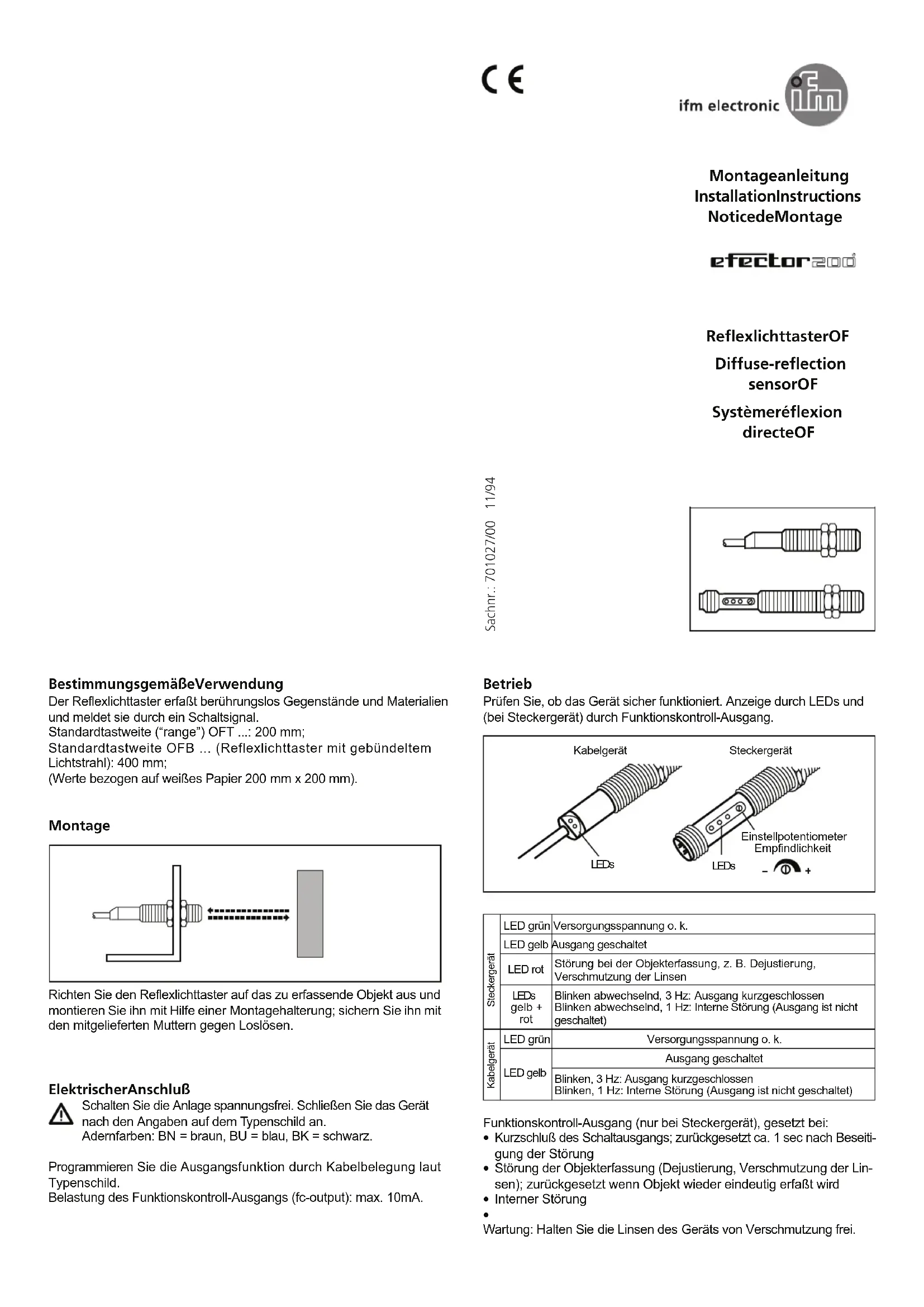 internal error Maintenance: Keep the lenses of the sensor free from soiling. Fonctionnement et caractéristiques Le système réflexion directe détecte des objets et de matières sans contact et indique leur présence par un signal de commutation. Portée standard OFT ...: 200 mm; portée standard OFB ... (système réflexion directe avec faisceau focalisé réglable): 400 mm. (Valeurs sur du papier blanc 200 mm x 200 mm). Montage Orienter le système réflexion directe en direction de lobjet à détecter et le monter avec une équerre de fixation; utiliser les écrous fournis pour une fixation optimale. Raccordement électrique Mettre linstallation hors tension avant le raccordement de la cellule optoélectronique. Raccordement strictement selon les indications de létiquette. Couleurs des fils: BN = brun, BU = bleu, BK = noir Programmation de la fonction de sortie par branchement selon létiquette. Charge de la sortie diagnostique (fc output): 10 mA maxi. Fonctionnement Vérifier le bon fonctionnement de la cellule. Indication par LED et (dans le cas des cellules avec raccordement par connecteur) par sortie diagnostique.