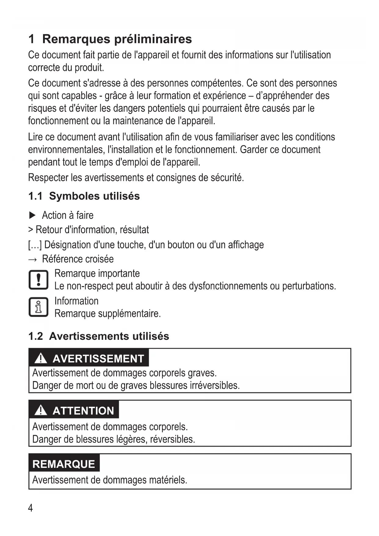 AVERTISSEMENT Avertissement de dommages corporels graves Danger de mort ou de graves blessures irréversibles ATTENTION Avertissement de dommages corporels Danger de blessures légères, réversibles REMARQUE Avertissement de dommages matériels5