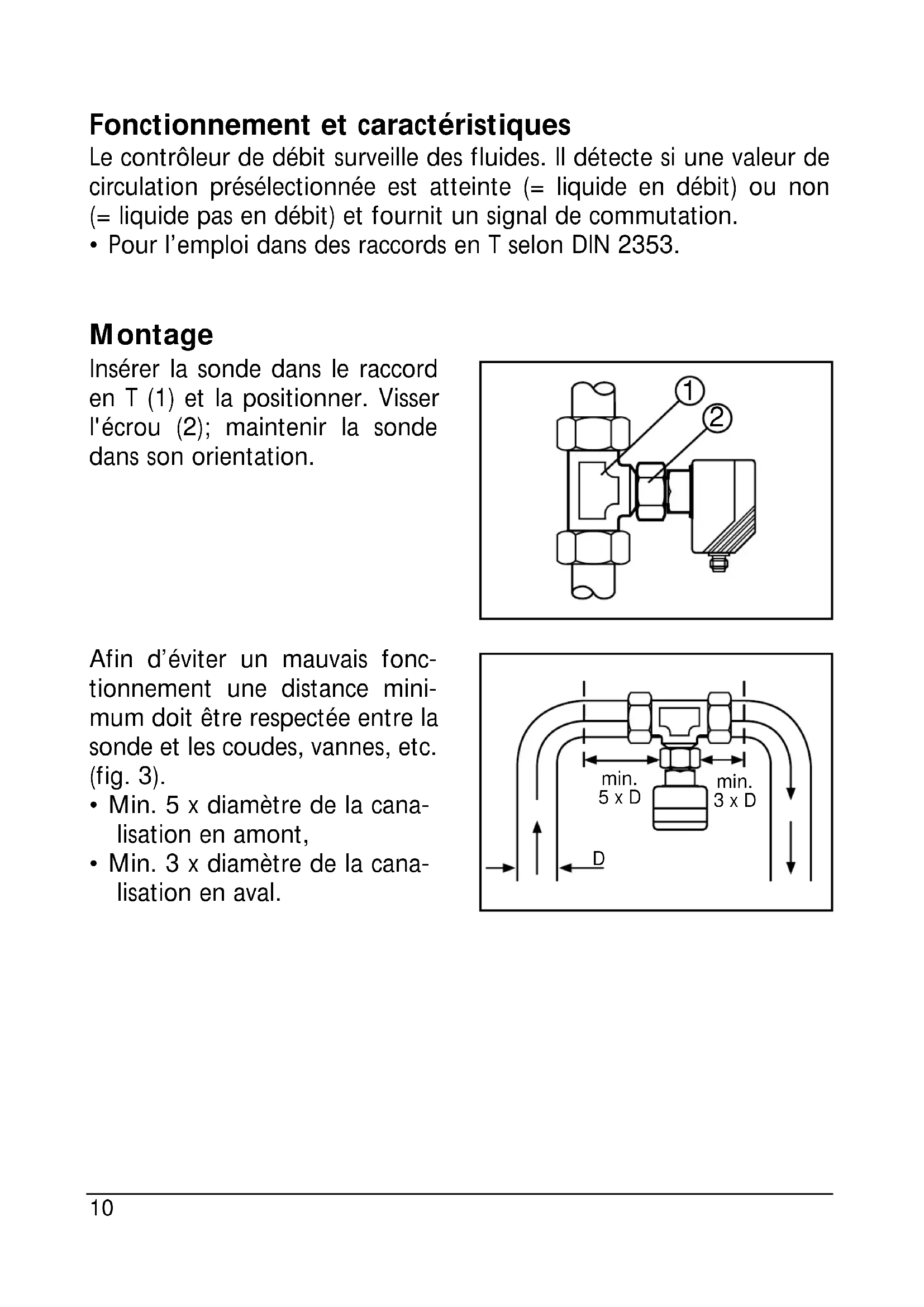 - Pour l’emploi dans des raccords en T selon DIN 2353. Montage Insérer la sonde dans le raccord en T (1) et la positionner. Visser l'écrou (2); maintenir la sonde dans son orientation. Afin d’éviter un mauvais fonc- tionnement une distance mini- mum doit être respectée entre la sonde et les coudes, vannes, etc. (fig. 3).