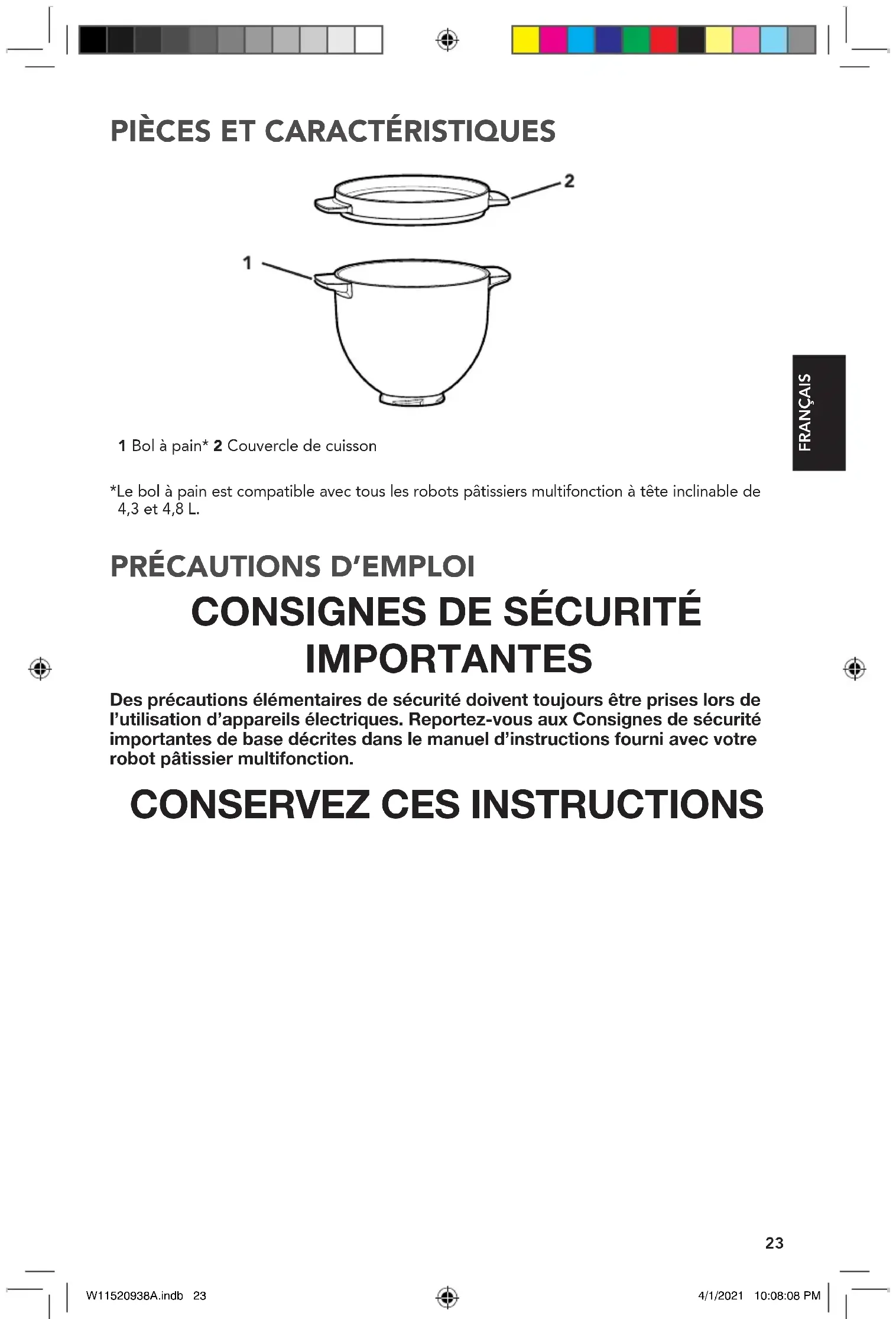 REMARQUE: les étapes d’utilisation du produit sont basées sur la carte de recette intégrée. Les étapes de la recette peuvent varier selon les indications figurant dans d’autres livres de recettes. Le bol à pain avec couvercle de cuisson peut être passé au four (jusqu’à 260 °C/500 °F). W11520938A.indb 25W11520938A.indb 25 4/1/2021 10:08:16 PM4/1/2021 10:08:16 PM26