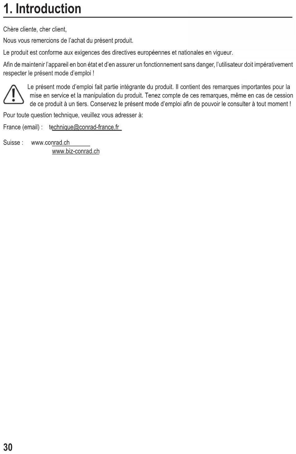Chère cliente, cher client, Nous vous remercions de l’achat du présent produit. Le produit est conforme aux exigences des directives européennes et nationales en vigueur. Andemaintenirl’appareilenbonétatetd’enassurerunfonctionnementsansdanger,l’utilisateurdoitimpérativement respecter le présent mode d’emploi ! Le présent mode d’emploi fait partie intégrante du produit. Il contient des remarques importantes pour la mise en service et la manipulation du produit. Tenez compte de ces remarques, même en cas de cession deceproduitàuntiers.Conservezleprésentmoded’emploiandepouvoirleconsulteràtoutmoment! Pourtoutequestiontechnique,veuillezvousadresserà: France(email): technique@conrad-france.fr Suisse: www.conrad.ch www.biz-conrad.ch31