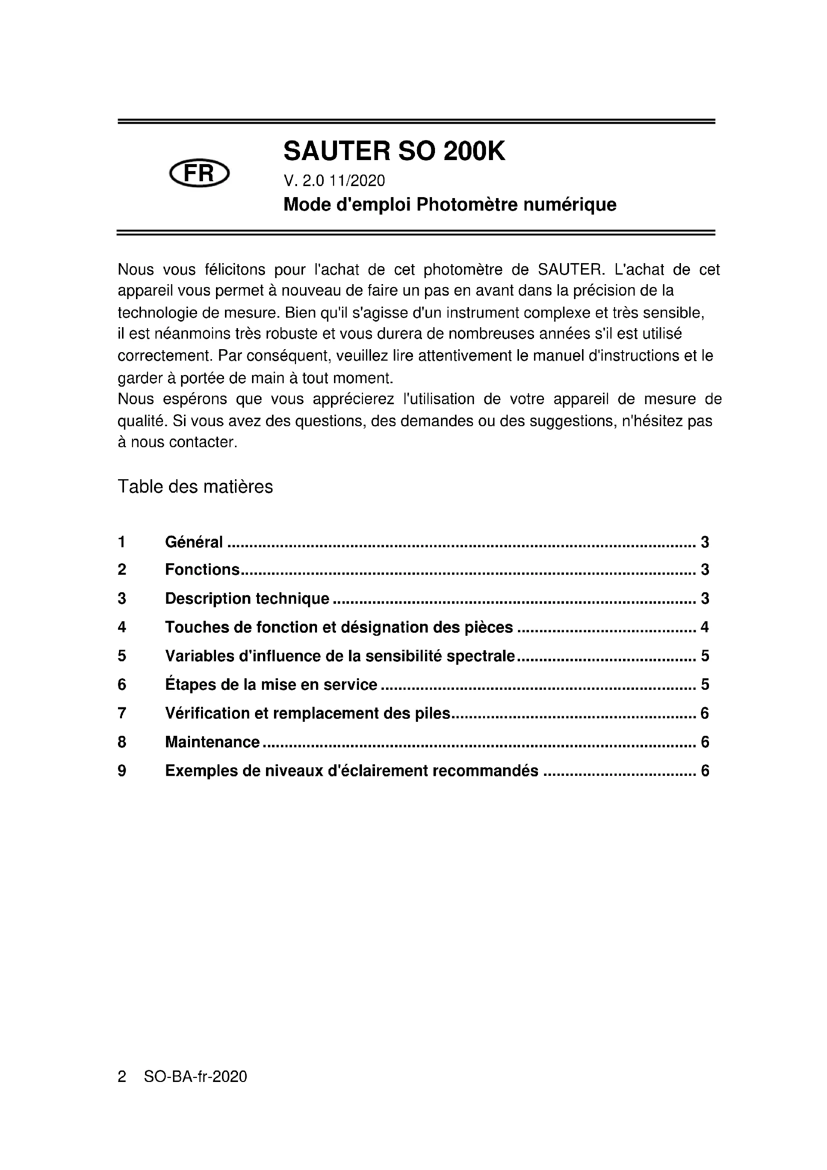 - Nous vous félicitons pour l'achat de cet photomètre de SAUTER. L'achat de cet appareil vous permet à nouveau de faire un pas en avant dans la précision de la technologie de mesure. Bien qu'il s'agisse d'un instrument complexe et très sensible, il est néanmoins très robuste et vous durera de nombreuses années s'il est utilisé correctement. Par conséquent, veuillez lire attentivement le manuel d'instructions et le garder à portée de main à tout moment. Nous espérons que vous apprécierez l'utilisation de votre appareil de mesure de qualité. Si vous avez des questions, des demandes ou des suggestions, n'hésitez pas à nous contacter. Table des matières 1 Général p. 3