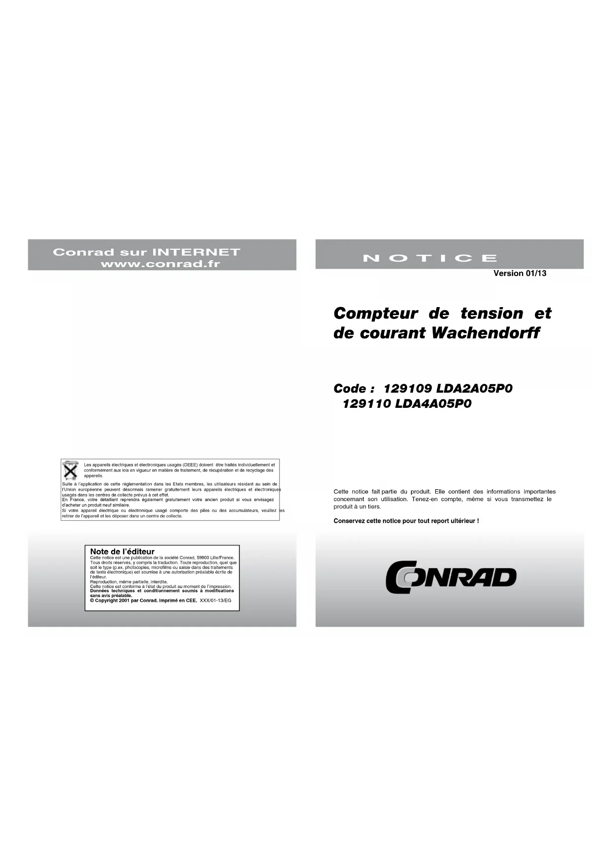 Note de l’éditeur Cette notice est une publication de la société Conrad, 59800 Lille/France.Tous droits réservés, y compris la traduction. Toute reproduction, quel que soit le type (p.ex. photocopies, microfilms ou saisie dans des traitements de texte électronique) est soumise à une autorisation préalable écrite de l’éditeur.Reproduction, même partielle, interdite.Cette notice est conforme à l’état du produit au moment de l’impression.Données techniques et conditionnement soumis à modifications sans avis préalable.© Copyright 2001 par Conrad. Imprimé en CEE. XXX/01-13/EG Compteur de tension et de courant Wachendorff Code : 129109 LDA2A05P0