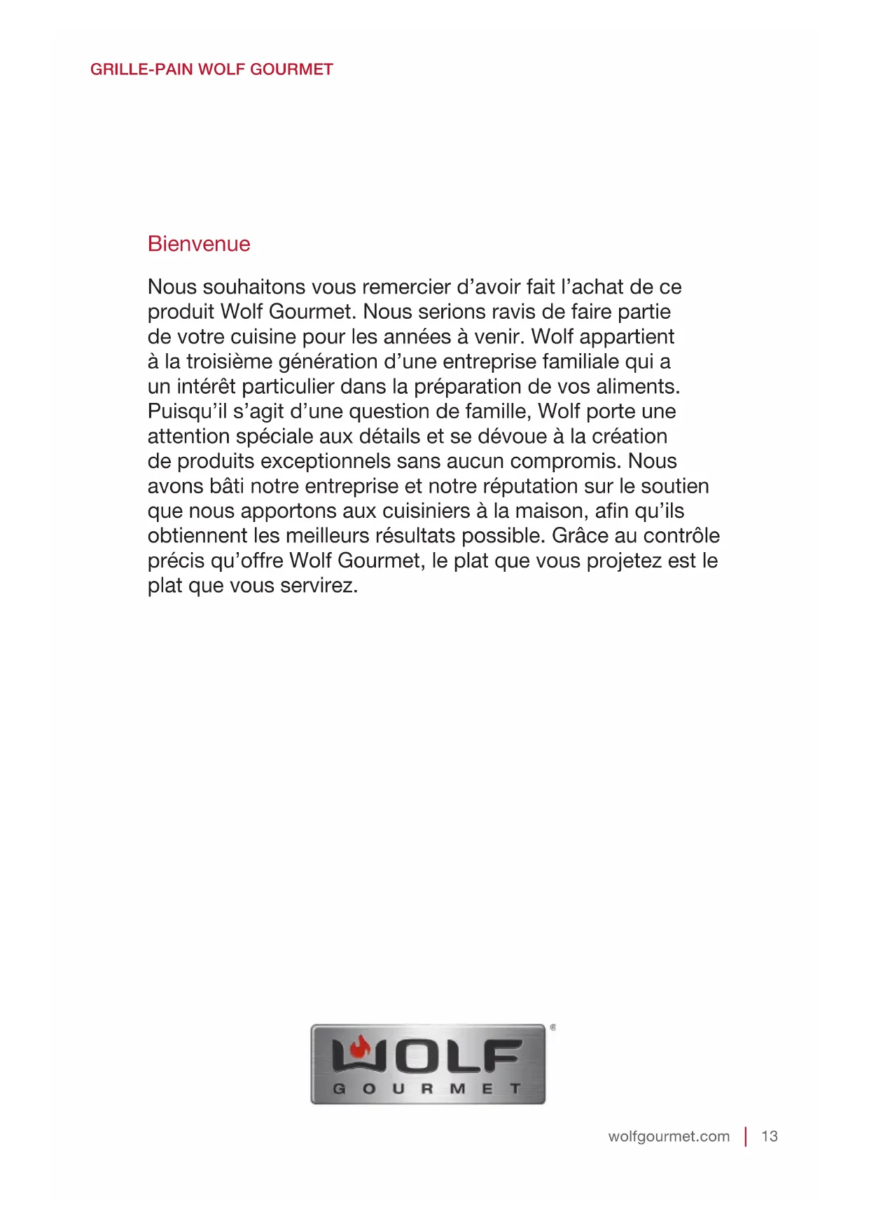 Bienvenue Nous souhaitons vous remercier d’avoir fait l’achat de ce produit Wolf Gourmet. Nous serions ravis de faire partie de votre cuisine pour les années à venir. Wolf appartient à la troisième génération d’une entreprise familiale qui a un intérêt particulier dans la préparation de vos aliments. Puisqu’il s’agit d’une question de famille, Wolf porte une attention spéciale aux détails et se dévoue à la création de produits exceptionnels sans aucun compromis. Nous avons bâti notre entreprise et notre réputation sur le soutien que nous apportons aux cuisiniers à la maison, an qu’ils obtiennent les meilleurs résultats possible. Grâce au contrôle précis qu’offre Wolf Gourmet, le plat que vous projetez est le plat que vous servirez. 840249003 FRv01.indd 13 2/20/15 9:36 AM14