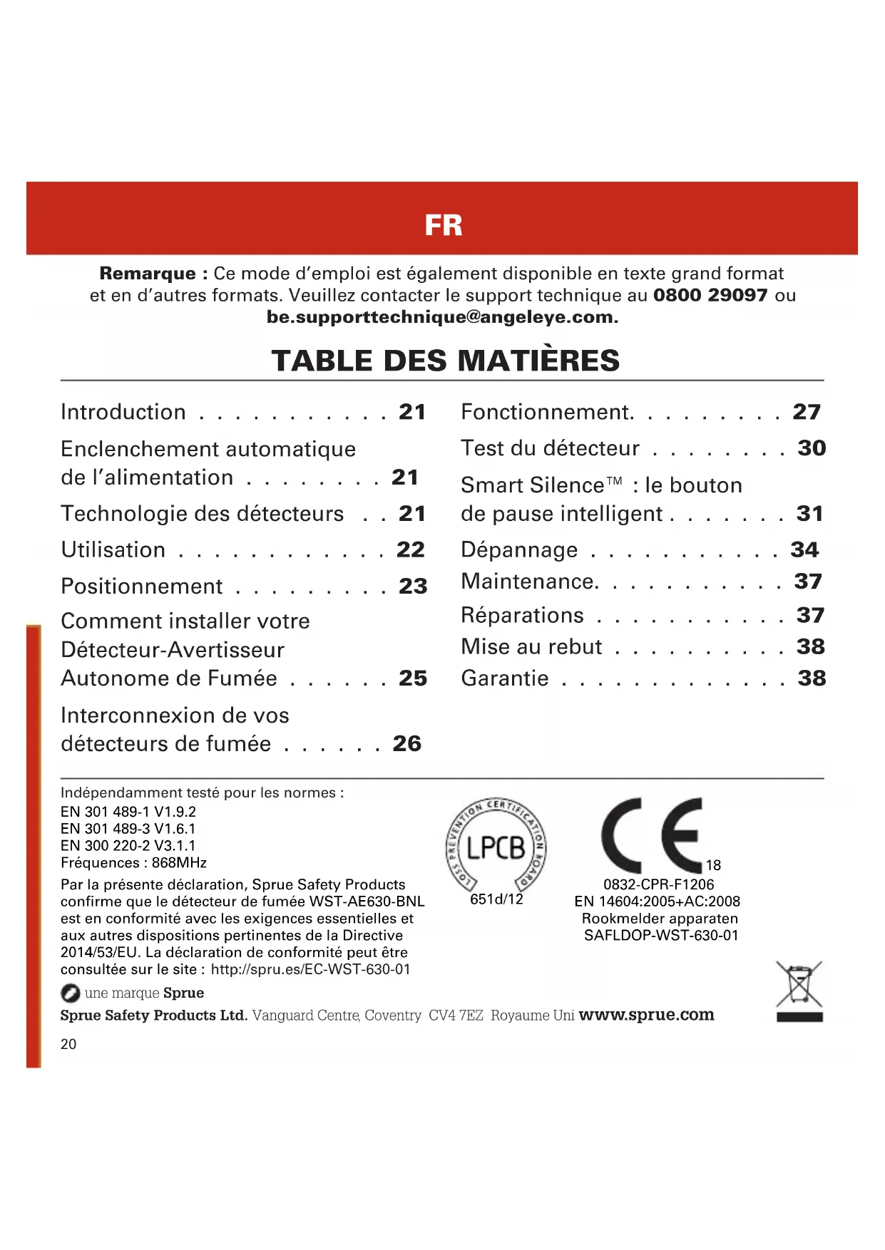 détecteur au feu. GARANTIE Sprue Safety Products Ltd garantit à l’acquéreur d’origine que le détecteur de fumée joint est exempt de tout défaut matériel et de fabrication dans le cadre d’une utilisation domestique et dans des conditions normales pour une période de 5 (cinq) ans à compter de la date d’achat. Sprue Safety Products Ltd garantit accepter de remplacer, à sa discrétion, l’appareil sans frais sur une période de 5 (cinq) ans à compter de la date d’achat, à condition que le produit soit retourné au revendeur avec une preuve d’achat datée. La garantie relative au remplacement du détecteur WST-AE630-BNL sera accordée pour le restant de la période de la garantie relative au détecteur acheté à l’origine - c’est-à-dire à compter de la date de l’achat initial, et non de la date de la réception du produit de remplacement. Sprue Safety Products Ltd se réserve le droit de proposer un produit alternatif, similaire à celui qui est remplacé, si le modèle d’origine n’est plus disponible ou en stock. Cette garantie s’applique à l’acquéreur d’origine à compter de la date d’achat initiale et n’est pas transférable. Une preuve d’achat est exigée. Cette garantie ne couvre pas les dommages résultant d’accidents, d’abus, de démontage, d’utilisation incorrecte ou de manque d’entretien raisonnable du produit, ou encore d’applications non conformes au mode d’emploi. Elle ne couvre pas les événements et situations échappant au contrôle de Sprue Safety Products Ltd, comme les cas de force majeure (incendie, intempéries, etc.). Elle ne s’applique pas aux détaillants, centres de service, distributeurs ou agents. Sprue Safety Products Ltd ne reconnaît aucune modication apportée à cette garantie par des tierces parties. Sprue Safety Products Ltd décline toute responsabilité pour tout dommage accidentel ou consécutif provoqué par l’infraction à une quelconque garantie expresse ou implicite. Sauf dans la mesure interdite par la loi applicable, toute garantie implicite de caractère commercialisable ou d’aptitude à une application donnée est limitée à 5 (cinq) ans. La présente garantie n’affecte pas vos droits légaux. À l’exception du décès ou de lésions personnelles, Sprue Safety Products Ltd décline toute responsabilité pour un(e) quelconque perte d’utilisation, dommage, coût ou frais relatifs à ce produit, ou pour un(e) quelconque perte, dommage ou frais indirects ou consécutifs encourus par vous ou tout autre utilisateur de ce produit.39Hierbij verklaart Sprue Safety Products LTD dat de WST-AE630-BNL voldoet aan de essentiële eisen en andere relevante bepalingen van Richtlijn 1999/5/EC. De verklaring van conformiteit kan worden geraadpleegd op: www.angeleye.nl. Par la présente, Sprue Safety Products déclare que l’appareil WST-AE630-BNL est conforme aux exigences essentielles et aux autres dispositions pertinentes de la directive 1999/5/CE. La déclaration de conformité peut être consultée sur le site : www.angeleye.fr.