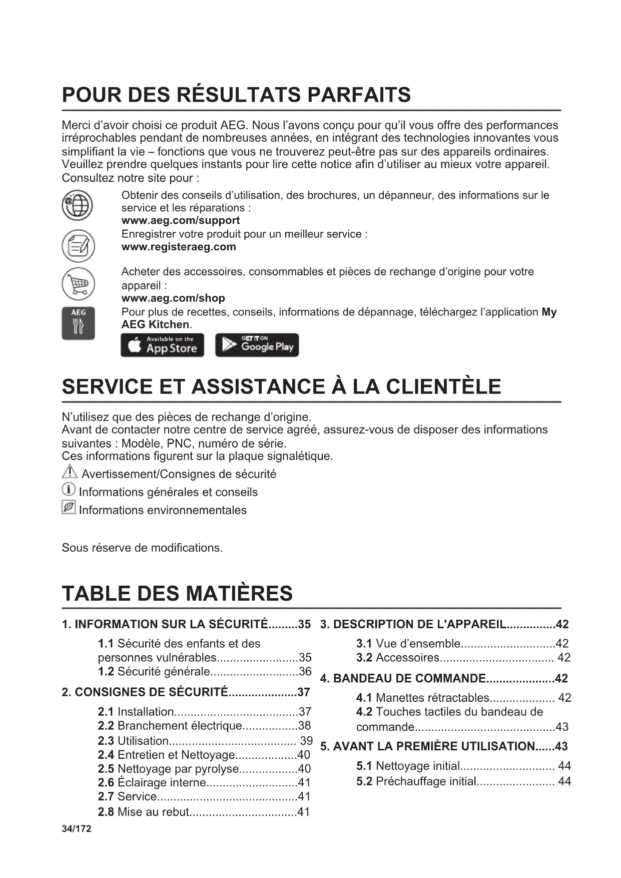 Merci d’avoir choisi ce produit AEG. Nous l’avons conçu pour qu’il vous offre des performances irréprochables pendant de nombreuses années, en intégrant des technologies innovantes vous simplifiant la vie – fonctions que vous ne trouverez peut-être pas sur des appareils ordinaires. Veuillez prendre quelques instants pour lire cette notice afin d’utiliser au mieux votre appareil. Consultez notre site pour : Obtenir des conseils d’utilisation, des brochures, un dépanneur, des informations sur le service et les réparations : www.aeg.com/support Enregistrer votre produit pour un meilleur service : www.registeraeg.com Acheter des accessoires, consommables et pièces de rechange d’origine pour votre appareil : www.aeg.com/shop Pour plus de recettes, conseils, informations de dépannage, téléchargez l’application My AEG Kitchen.