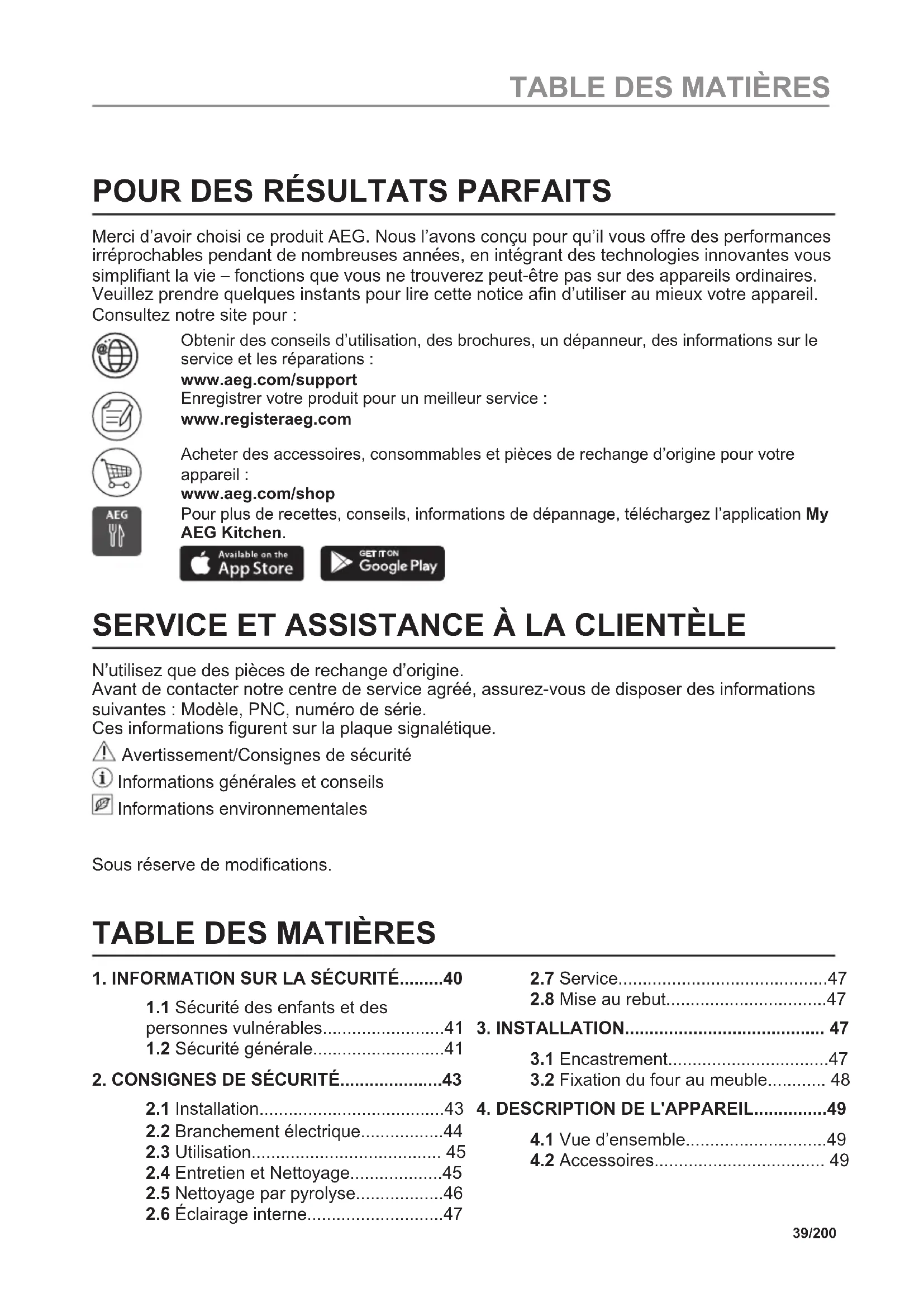 Merci d’avoir choisi ce produit AEG. Nous l’avons conçu pour qu’il vous offre des performances irréprochables pendant de nombreuses années, en intégrant des technologies innovantes vous simplifiant la vie – fonctions que vous ne trouverez peut-être pas sur des appareils ordinaires. Veuillez prendre quelques instants pour lire cette notice afin d’utiliser au mieux votre appareil. Consultez notre site pour : Obtenir des conseils d’utilisation, des brochures, un dépanneur, des informations sur le service et les réparations : www.aeg.com/support Enregistrer votre produit pour un meilleur service : www.registeraeg.com Acheter des accessoires, consommables et pièces de rechange d’origine pour votre appareil : www.aeg.com/shop Pour plus de recettes, conseils, informations de dépannage, téléchargez l’application My AEG Kitchen.