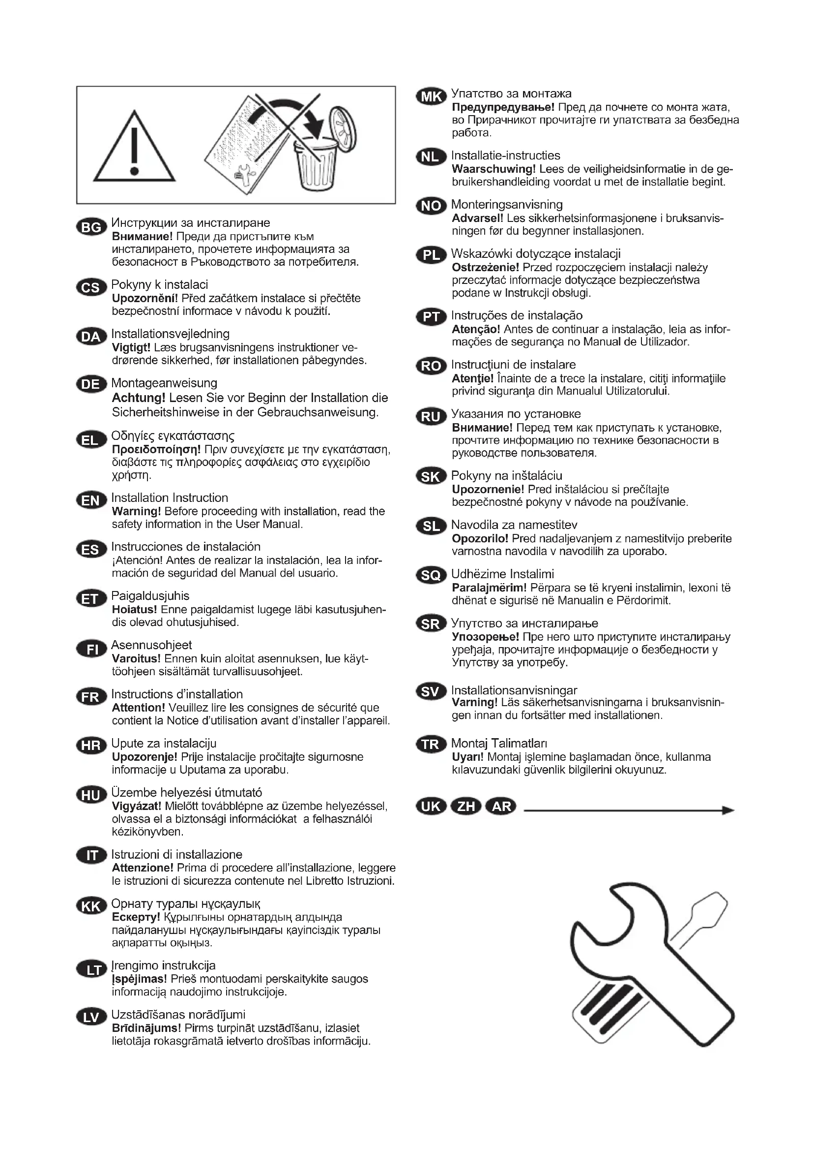 Instructions d’installation Attention! Veuillez lire les consignes de sécurité que contient la Notice d’utilisation avant d’installer l’appareil.