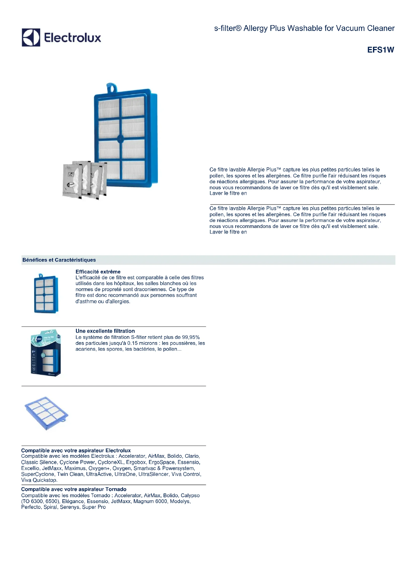 Compatible avec votre aspirateur Tornado Compatible avec les modèles Tornado : Accelerator, AirMax, Bolido, Calypso (TO 6300, 6500), Elégance, Essensio, JetMaxx, Magnum 6000, Modelys, Perfecto, Spiral, Serenys, Super Pro Compatible avec votre aspirateur Electrolux Compatible avec les modèles Electrolux : Accelerator, AirMax, Bolido, Clario, Classic Silence, Cyclone Power, CycloneXL, Ergobox, ErgoSpace, Essensio, Excellio, JetMaxx, Maximus, Oxygen+, Oxygen, Smartvac & Powersystem, SuperCyclone, Twin Clean, UltraActive, UltraOne, UltraSilencer, Viva Control, Viva Quickstop. Une excellente filtration Le système de filtration S-filter retient plus de 99,95% des particules jusqu'à 0.15 microns : les poussières, les acariens, les spores, les bactéries, le pollen... Efficacité extrême L'efficacité de ce filtre est comparable à celle des filtres utilisés dans les hôpitaux, les salles blanches où les normes de propreté sont draconiennes. Ce type de filtre est donc recommandé aux personnes souffrant d'asthme ou d'allergies. Ce filtre lavable Allergie Plus™ capture les plus petites particules telles le pollen, les spores et les allergènes. Ce filtre purifie l'air réduisant les risques de réactions allergiques. Pour assurer la performance de votre aspirateur, nous vous recommandons de laver ce filtre dès qu'il est visiblement sale. Laver le filtre en Ce filtre lavable Allergie Plus™ capture les plus petites particules telles le pollen, les spores et les allergènes. Ce filtre purifie l'air réduisant les risques de réactions allergiques. Pour assurer la performance de votre aspirateur, nous vous recommandons de laver ce filtre dès qu'il est visiblement sale. Laver le filtre en Bénéfices et Caractéristiques s-filter® Allergy Plus Washable for Vacuum Cleaner EFS1WDistriCode