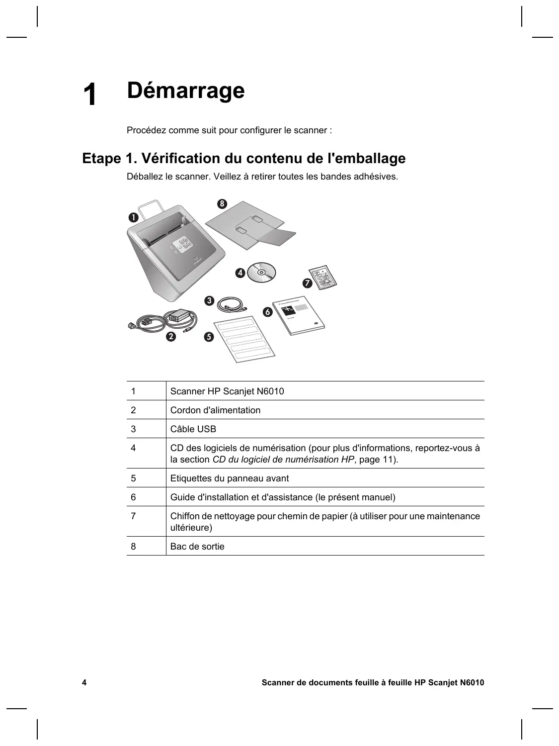 Démarrage Procédez comme suit pour configurer le scanner : Etape 1. Vérification du contenu de l'emballage Déballez le scanner. Veillez à retirer toutes les bandes adhésives.