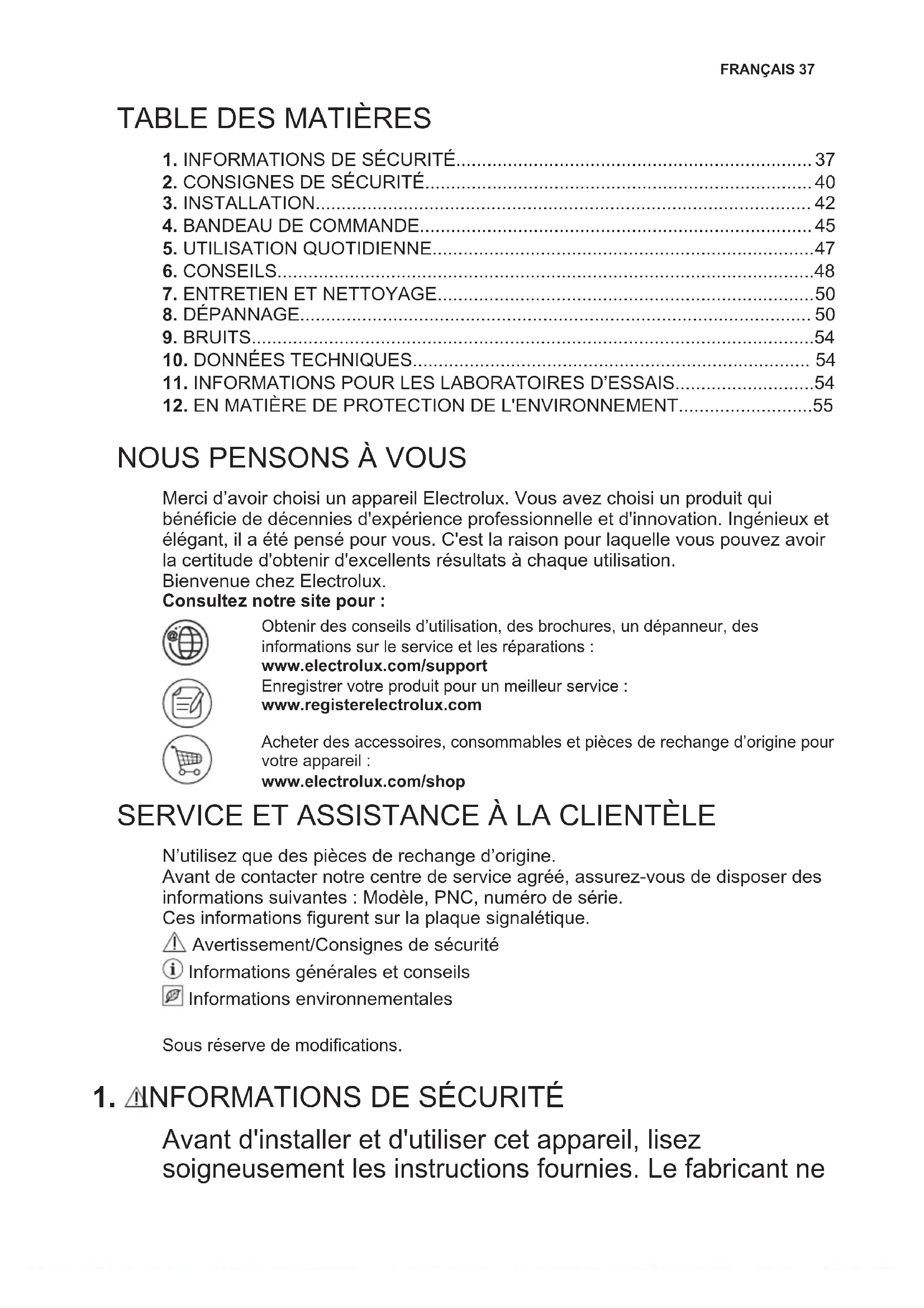 Merci d’avoir choisi un appareil Electrolux. Vous avez choisi un produit qui bénéficie de décennies d'expérience professionnelle et d'innovation. Ingénieux et élégant, il a été pensé pour vous. C'est la raison pour laquelle vous pouvez avoir la certitude d'obtenir d'excellents résultats à chaque utilisation. Bienvenue chez Electrolux. Consultez notre site pour : Obtenir des conseils d’utilisation, des brochures, un dépanneur, des informations sur le service et les réparations : www.electrolux.com/support Enregistrer votre produit pour un meilleur service : www.registerelectrolux.com Acheter des accessoires, consommables et pièces de rechange d’origine pour votre appareil : www.electrolux.com/shop