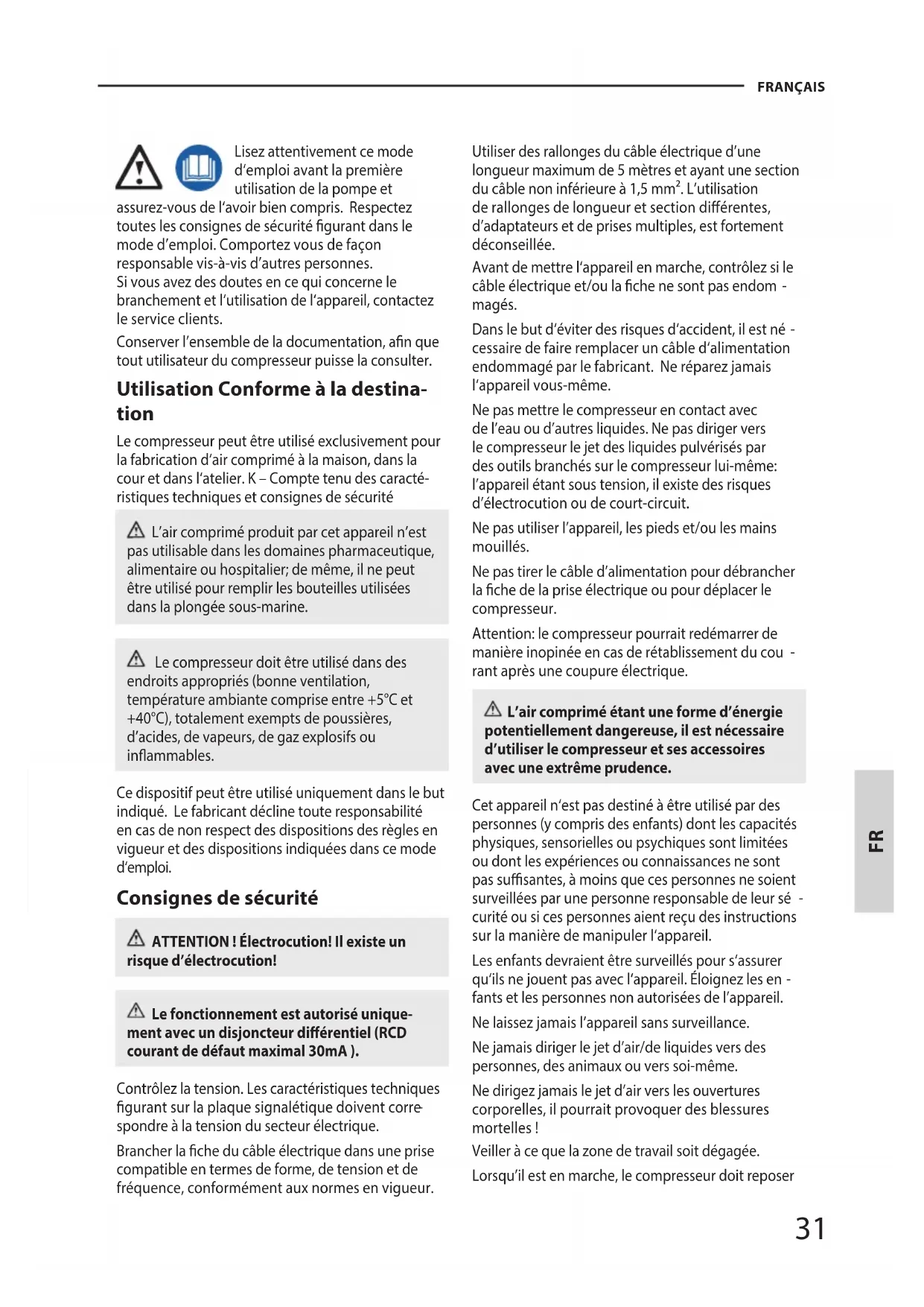 Lisez attentivement ce mode d‘emploi avant la première utilisation de la pompe et assurez-vous de l‘avoir bien compris. Respectez toutes les consignes de sécurité gurant dans le mode d’emploi. Comportez vous de façon responsable vis-à-vis d’autres personnes. Si vous avez des doutes en ce qui concerne le branchement et l‘utilisation de l‘appareil, contactez le service clients. Conserver l’ensemble de la documentation, an que tout utilisateur du compresseur puisse la consulter. Utilisation Conforme à la destina- tion Le compresseur peut être utilisé exclusivement pour la fabrication d‘air comprimé à la maison, dans la cour et dans l‘atelier. K – Compte tenu des caracté- ristiques techniques et consignes de sécurité L’air comprimé produit par cet appareil n’est pas utilisable dans les domaines pharmaceutique, alimentaire ou hospitalier; de même, il ne peut être utilisé pour remplir les bouteilles utilisées dans la plongée sous-marine. Le compresseur doit être utilisé dans des endroits appropriés (bonne ventilation, température ambiante comprise entre +5°C et +40°C), totalement exempts de poussières, d’acides, de vapeurs, de gaz explosifs ou inammables. Ce dispositif peut être utilisé uniquement dans le but indiqué. Le fabricant décline toute responsabilité en cas de non respect des dispositions des règles en vigueur et des dispositions indiquées dans ce mode d‘emploi. Consignes de sécurité ATTENTION ! Électrocution! Il existe un risque d’électrocution! Le fonctionnement est autorisé unique- ment avec un disjoncteur diérentiel (RCD courant de défaut maximal 30mA ). Contrôlez la tension. Les caractéristiques techniques gurant sur la plaque signalétique doivent corre