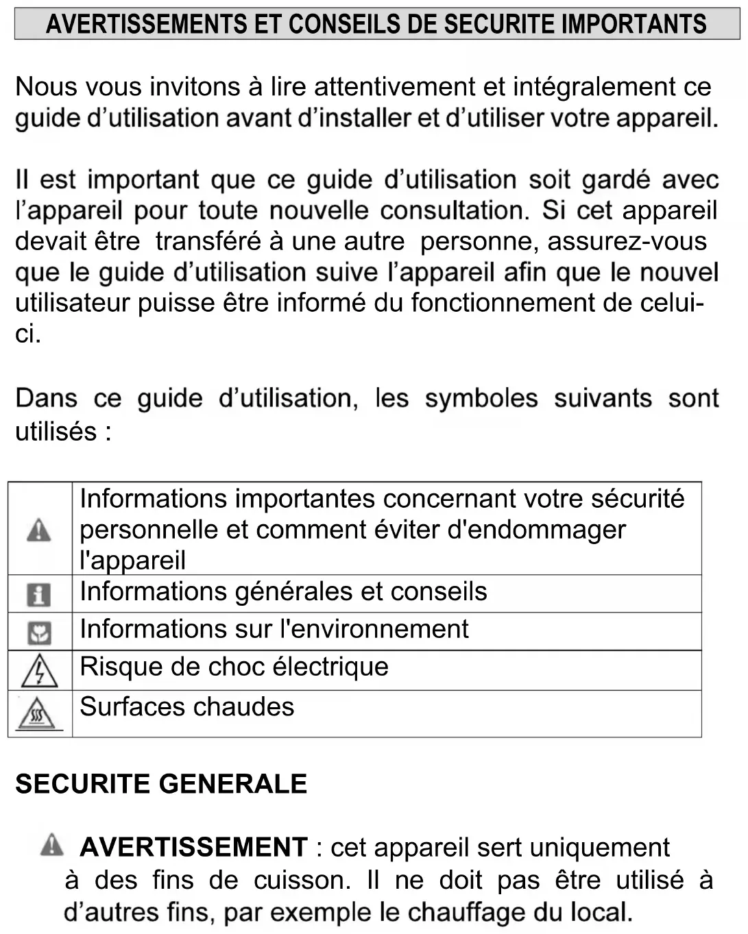 Les conditions de réglage de cet appareil sont inscrites sur e signalétique) des produits de la combustion. Il doit être installé et Une attention particulière sera accordée aux dispositions applicables en matière de ventilation. UTILISATION Votre appareil est destiné à un usage domestique normal. Ne pas modifier ou ne pas essayer de modifier les caractéristiques de cet appareil. Cela représenterait un danger pour vous. Avant la première utilisation de votre appareil, faire chauffer et les graisses de protection utilisées lors de la fabrication.8 en fonctionnement ou fenêtre ouverte pour limiter les ATTENTION : Une utilisation intensive et plus efficace, par exemple en ouvrant la fenêtre ou en augmentant la puissance de la ventilation mécanique si elle existe. Surveillez attentivement la cuisson lors de friture dans