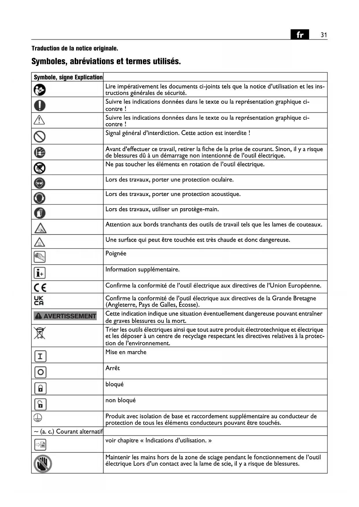 Traduction de la notice originale. Symboles, abréviations et termes utilisés. Symbole, signe Explication Lire impérativement les documents ci-joints tels que la notice d’utilisation et les ins- tructions générales de sécurité. Suivre les indications données dans le texte ou la représentation graphique ci- contre ! Suivre les indications données dans le texte ou la représentation graphique ci- contre ! Signal général d’interdiction. Cette action est interdite ! Avant d’effectuer ce travail, retirer la fiche de la prise de courant. Sinon, il y a risque de blessures dû à un démarrage non intentionné de l’outil électrique. Ne pas toucher les éléments en rotation de l’outil électrique. Lors des travaux, porter une protection oculaire. Lors des travaux, porter une protection acoustique. Lors des travaux, utiliser un psrotège-main. Attention aux bords tranchants des outils de travail tels que les lames de couteaux. Une surface qui peut être touchée est très chaude et donc dangereuse. Poignée Information supplémentaire. Confirme la conformité de l’outil électrique aux directives de l’Union Européenne. Confirme la conformité de l’outil électrique aux directives de la Grande Bretagne (Angleterre, Pays de Galles, Écosse). Cette indication indique une situation éventuellement dangereuse pouvant entraîner de graves blessures ou la mort. Trier les outils électriques ainsi que tout autre produit électrotechnique et électrique et les déposer à un centre de recyclage respectant les directives relatives à la protec- tion de l’environnement. Mise en marche Arrêt bloqué non bloqué Produit avec isolation de base et raccordement supplémentaire au conducteur de protection de tous les éléments conducteurs pouvant être touchés. ~ (a. c.) Courant alternatif voir chapitre « Indications d’utilisation. » Maintenir les mains hors de la zone de sciage pendant le fonctionnement de l’outil électrique Lors d’un contact avec la lame de scie, il y a risque de blessures. AVERTISSEMENT32