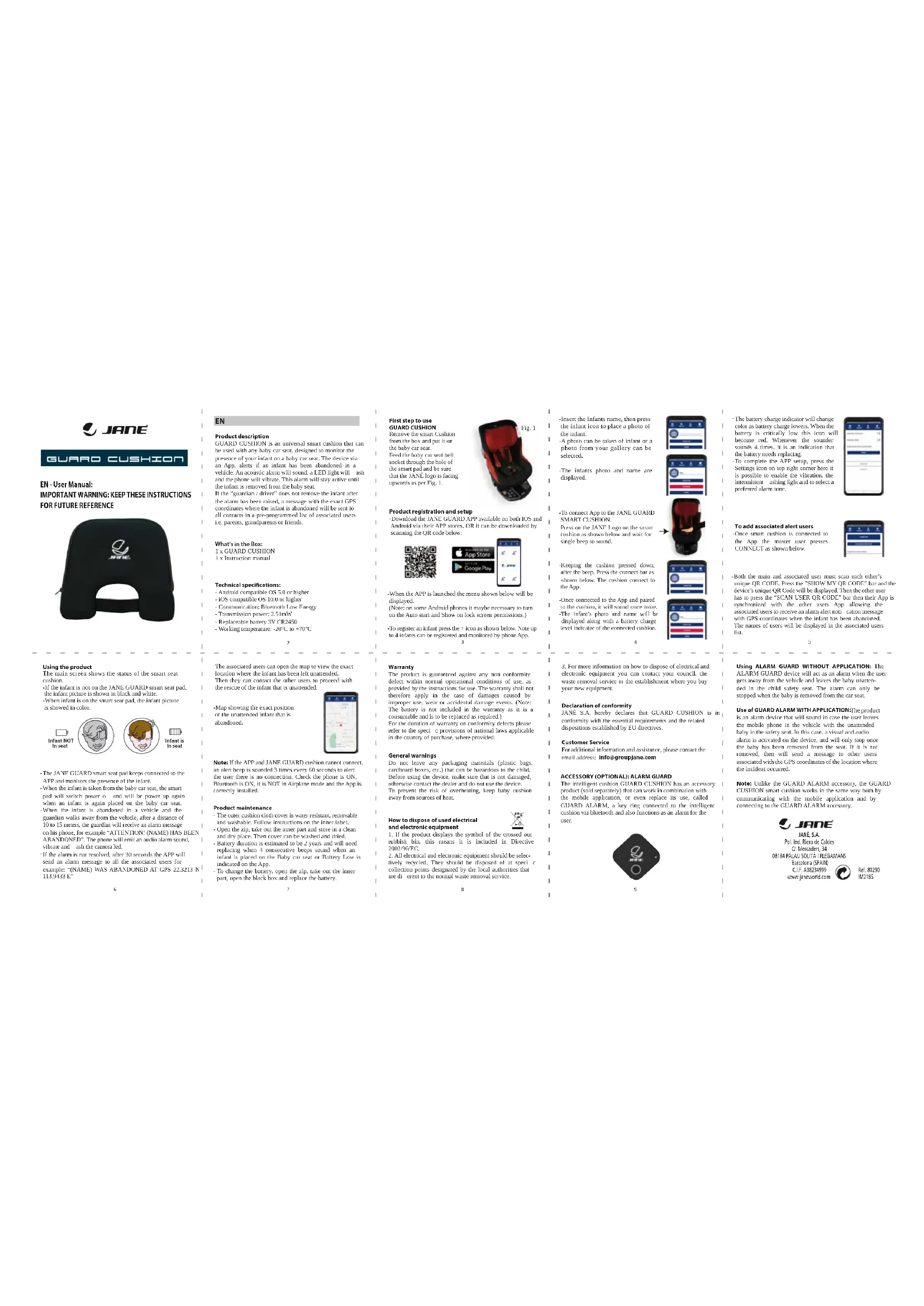 Première étape pour l’utilisation de GUARD CUSHION Sortez le coussin intelligent de sa boîte et installez-le sur le siège auto. Passez la boucle de la ceinture de sécurité de la voiture dans l’orice du coussin intelligent et vériez si le logotype de JANÉ est tourné vers le haut tel qu’indiqué sur la gure 1. Spécifications techniques : -Système d’exploitation compatible avec Android 5.0 ou version supérieure -Système d’exploitation compatible avec iOS 10.0 ou version supérieure - Communication : Bluetooth à basse consommation - Puissance de transmission : 2,51 mW. - Batterie remplaçable 3 V CR2450 - Température de fonctionnement : de -20 °C à + 70 °C Fig. 1 Note: si l’application et le coussin GUARD CUSHION, ne peuvent pas se connecter, une alarme retentit trois fois toutes les 60 secondes pour avertir l’utilisateur de l’absence de connexion. Vériez si le téléphone est ALLUMÉ, si le bluetooth est ALLUMÉ, si le téléphone n’est pas sur le mode avion et si l’application a été installée correctement. Entretien du produit -La housse extérieure en tissu du coussin est résistante à l’eau, amovible et lavable. Veuillez suivre les indications de l’étiquette intérieure. -Ouvrez la fermeture éclair, retirez la partie intérieure et rangez-la dans un endroit propre et sec. La housse peut être lavée et séchée. -La batterie a une durée d’environ 2 ans et elle devra être remplacée dès que les 4 signaux acoustiques consécutifs retentissent lorsque vous installez votre bébé dans le siège auto ou si l’indication Battery Low (batterie faible) apparaît sur l’application. -Pour changer la batterie, ouvrez la fermeture éclair, retirez la partie intérieure, ouvrez le boîtier noir et remplacez la batterie. Garantie Le produit est garanti contre tout défaut de conformité dans des conditions normales d’utilisation selon les indications de la notice d’utilisation. Par conséquent, la garantie ne sera pas applicable en cas de dommages provoqués par une utilisation inappropriée, l’usure ou des dommages accidentels. (Note : la batterie n’est pas comprise dans la garantie car c’est un consommable qui doit être remplacé dès que nécessaire). Pendant la durée en vigueur de la garantie contre les défauts de conformité, veuillez consulter les dispositions spéciques de la norme applicable dans le pays où l’achat a été eectué. Mises en garde générales Retirez immédiatement les matériaux d’emballage (sacs en plastique, cartons, etc.) qui risquent de présenter un danger pour l’enfant. Avant d’utiliser le dispositif, vériez s’il n’est pas endommagé ; dans le cas contraire, veuillez contacter le distributeur et n’utilisez pas le dispositif. An d’éviter tout risque de surchaue, veuillez conserver le coussin du bébé à l’écart de toute source de chaleur. Déclaration de conformité JANÉ S.A. déclare que le coussin GUARD CUSHION est conforme aux exigences essentielles et aux dispositions correspondantes établies par les directives de l’UE. Service client Pour de plus amples informations et toute demande d’assistance, veuillez nous contacter à l’adresse électronique suivante : info@groupjane.com