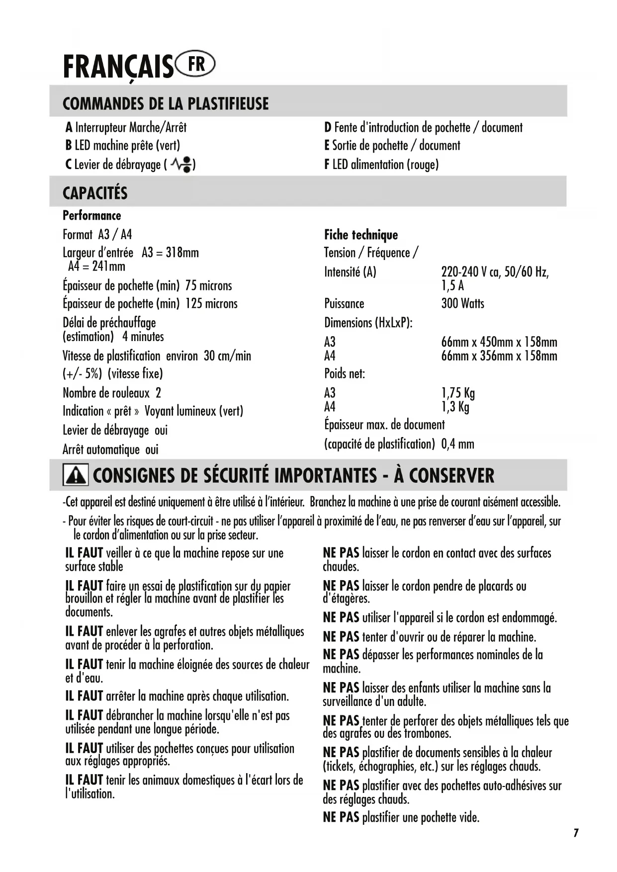 D Fente d'introduction de pochette / document E Sortie de pochette / document F LED alimentation (rouge) CAPACITÉS Performance Format A3 / A4 Largeur d’entrée A3 = 318mm A4 = 241mm Épaisseur de pochette (min) 75 microns Épaisseur de pochette (min) 125 microns Délai de préchauffage (estimation) 4 minutes Vitesse de plastification environ 30 cm/min (+/- 5%) (vitesse fixe) Nombre de rouleaux 2 Indication « prêt » Voyant lumineux (vert) Levier de débrayage oui Arrêt automatique oui Fiche technique Tension / Fréquence / Intensité (A) 220-240 V ca, 50/60 Hz, 1,5 A Puissance 300 Watts Dimensions (HxLxP): A3 66mm x 450mm x 158mm A4 66mm x 356mm x 158mm Poids net: A3 1,75 Kg A4 1,3 Kg Épaisseur max. de document (capacité de plastification) 0,4 mm -Cet appareil est destiné uniquement à être utilisé à l’intérieur. Branchez la machine à une prise de courant aisément accessible. - Pour éviter les risques de court-circuit - ne pas utiliser l’appareil à proximité de l’eau, ne pas renverser d’eau sur l’appareil, sur le cordon d’alimentation ou sur la prise secteur. IL FAUT veiller à ce que la machine repose sur une surface stable IL FAUT faire un essai de plastification sur du papier brouillon et régler la machine avant de plastifier les documents. IL FAUT enlever les agrafes et autres objets métalliques avant de procéder à la perforation. IL FAUT tenir la machine éloignée des sources de chaleur et d'eau. IL FAUT arrêter la machine après chaque utilisation. IL FAUT débrancher la machine lorsqu'elle n'est pas utilisée pendant une longue période. IL FAUT utiliser des pochettes conçues pour utilisation aux réglages appropriés. IL FAUT tenir les animaux domestiques à l'écart lors de l'utilisation. NE PAS laisser le cordon en contact avec des surfaces chaudes. NE PAS laisser le cordon pendre de placards ou d'étagères. NE PAS utiliser l'appareil si le cordon est endommagé. NE PAS tenter d'ouvrir ou de réparer la machine. NE PAS dépasser les performances nominales de la machine. NE PAS laisser des enfants utiliser la machine sans la surveillance d'un adulte. NE PAS tenter de perforer des objets métalliques tels que des agrafes ou des trombones. NE PAS plastifier de documents sensibles à la chaleur (tickets, échographies, etc.) sur les réglages chauds. NE PAS plastifier avec des pochettes auto-adhésives sur des réglages chauds. NE PAS plastifier une pochette vide. FRANÇAIS FRFONCTIONS & CONSEILS Fonction 'Déblocage' Pour enlever ou repositionner une pochette pendant la plastification, actionner le levier de déblocage qui se trouve à l'arrière de la machine. La pochette peut uniquement être extraite de la fente d'introduction lorsque ce levier est actionné. Arrêt automatique Au bout de 30 minutes, la machine passe automatiquement en mode d’arrêt au- tomatique. Le LED d’alimentation clignotera pendant 5 minutes puis s’éteindra. Le LED indiquant que la machine est prête s’éteindra. Pour continuer à utiliser la machine, appuyer sur le bouton ON/OFF. La machine se réinitialisera. t Pour les meilleurs résultats, utiliser des pochettes de la marque Fellowes® : 80 - 125 microns. t Cette machine n'a pas besoin d'un transporteur pour plastifier. Son mécanisme est un mécanisme sans transporteur. t Toujours placer le document à plastifier dans une pochette de la taille appropriée. t Toujours effectuer un test avec un document de taille et d'épaisseur similaires avant de plastifier le docu- ment proprement dit. t Préparer la pochette et le document à plastifier. Placer le document dans la pochette, il doit être bien centré et toucher le bord déjà soudé. Vérifier que la pochette n'est pas trop grande pour le document. t Le cas échéant, recouper les bords une fois le docu- ment plastifié et refroidi.