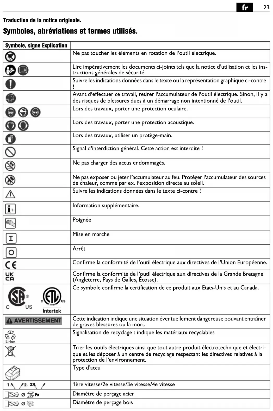 Avant d’effectuer ce travail, retirer l’accumulateur de l’outil électrique. Sinon, il y a des risques de blessures dues à un démarrage non intentionné de l’outil. Lors des travaux, porter une protection oculaire. Lors des travaux, porter une protection acoustique. Lors des travaux, utiliser un protège-main. Signal d’interdiction général. Cette action est interdite ! Ne pas charger des accus endommagés. Ne pas exposer ou jeter l’accumulateur au feu. Protéger l’accumulateur des sources de chaleur, comme par ex. l’exposition directe au soleil. Suivre les indications données dans le texte ci-contre ! Information supplémentaire. Poignée Mise en marche Arrêt Confirme la conformité de l’outil électrique aux directives de l’Union Européenne. Confirme la conformité de l’outil électrique aux directives de la Grande Bretagne (Angleterre, Pays de Galles, Écosse). Ce symbole confirme la certification de ce produit aux Etats-Unis et au Canada. Cette indication indique une situation éventuellement dangereuse pouvant entraîner de graves blessures ou la mort. Signalisation de recyclage : indique les matériaux recyclables Trier les outils électriques ainsi que tout autre produit électrotechnique et électri- que et les déposer à un centre de recyclage respectant les directives relatives à la protection de l’environnement. Type d’accu 1ère vitesse/2e vitesse/3e vitesse/4e vitesse Diamètre de perçage acier Diamètre de perçage bois AVERTISSEMENT