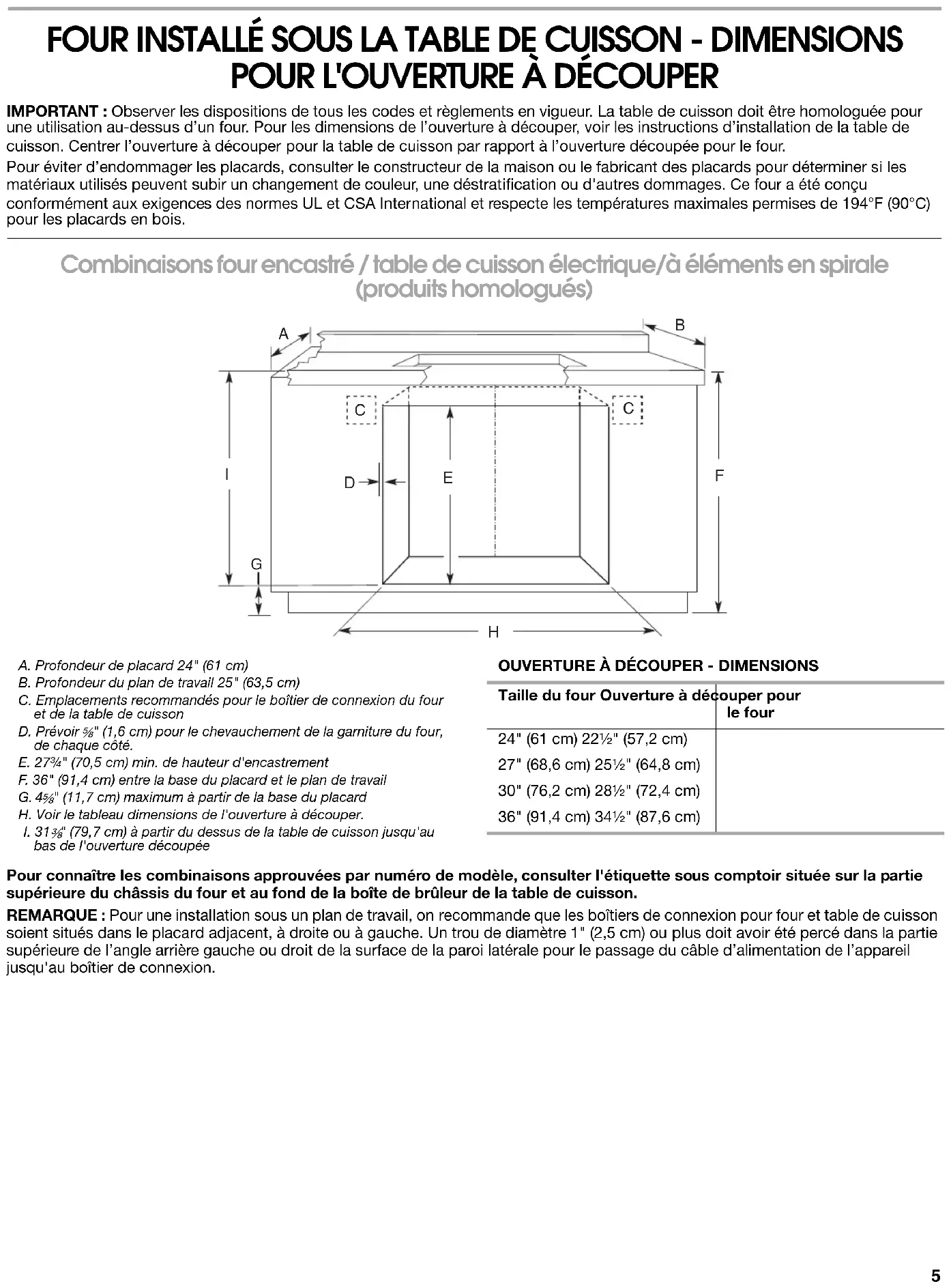 Combinaisons four encastré / table de cuisson à induction (produits homologués) Pour connaître les combinaisons approuvées par numéro de modèle, consulter l'étiquette sous comptoir située sur la partie supérieure du châssis du four et au fond de la boîte de brûleur de la table de cuisson. REMARQUE : Pour une installation sous un plan de travail, on recommande que les boîtiers de connexion pour four et table de cuisson soient situés dans le placard adjacent, à droite ou à gauche. Un trou de diamètre 1" (2,5 cm) ou plus doit avoir été percé dans la partie supérieure de l’angle arrière gauche ou droit de la surface de la paroi latérale pour le passage du câble d’alimentation de l’appareil jusqu'au boîtier de connexion. A. Profondeur de placard 24" (61 cm)B. Profondeur du plan de travail 25" (63,5 cm)C. Emplacements recommandés pour le boîtier de connexion du four et de la table de cuisson.D. Prévoir " (1,6 cm) pour le chevauchement de la garniture du four, de chaque côté.E. 27¾" (70,5 cm) min. de hauteur d'encastrement F. 36" (91,4 cm) entre la base du placard et le plan de travail G. 3⁵⁄₈" (9,2 cm) à partir de la base du placard. Si la dimension “F” est supérieure à 36" (91,4 cm), la dimension “G” peut être augmentée de la même différence pour des combinaisons d’appareils à induction.H. Voir le tableau dimensions de l'ouverture à découper.I. 32 " (82,2 cm) from top of countertop to bottom of cutout