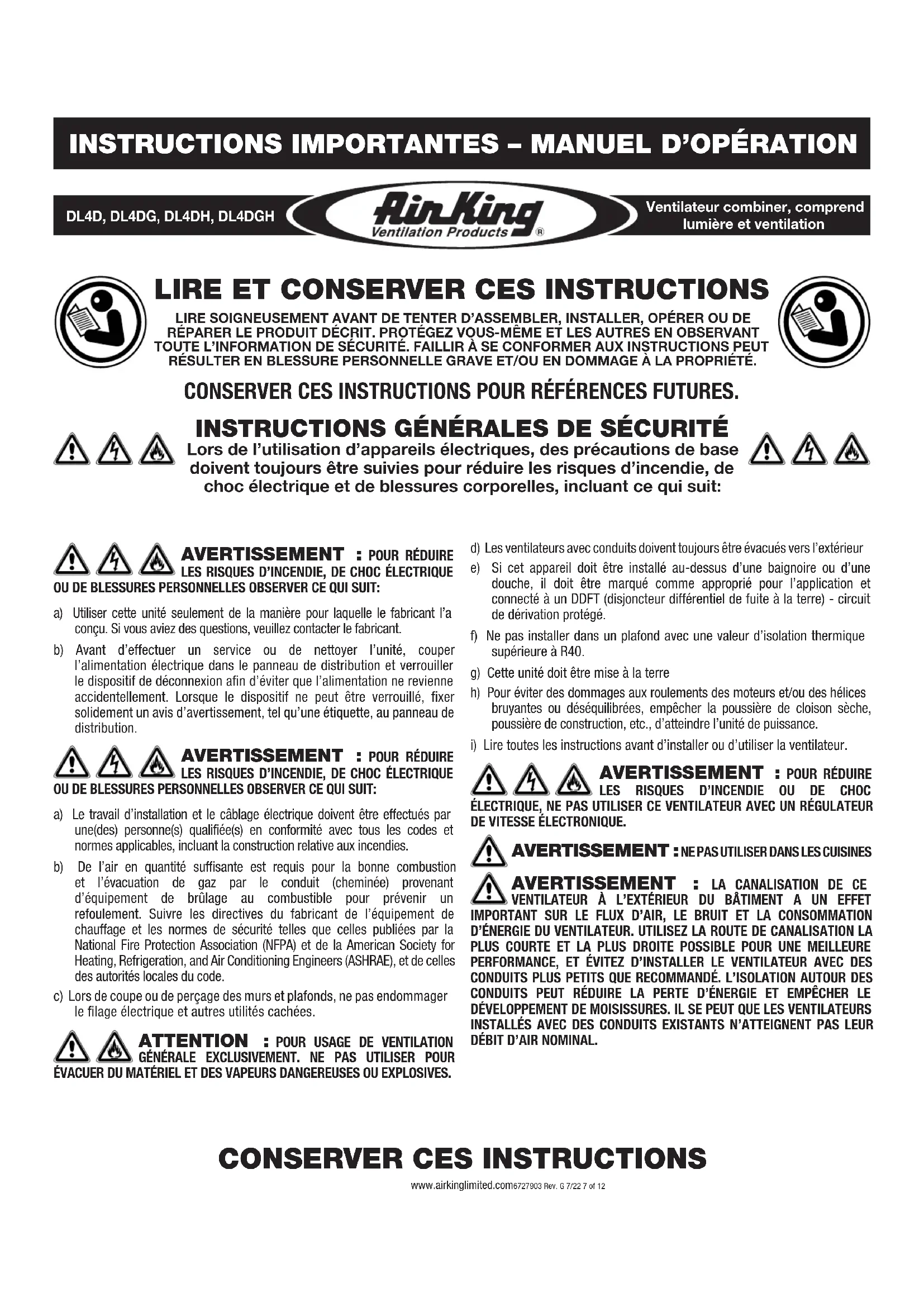 Ventilateur combiner, comprend lumière et ventilation DL4D, DL4DG, DL4DH, DL4DGHwww.airkinglimited.com6727903 Rev. G 7/22 8 of 12