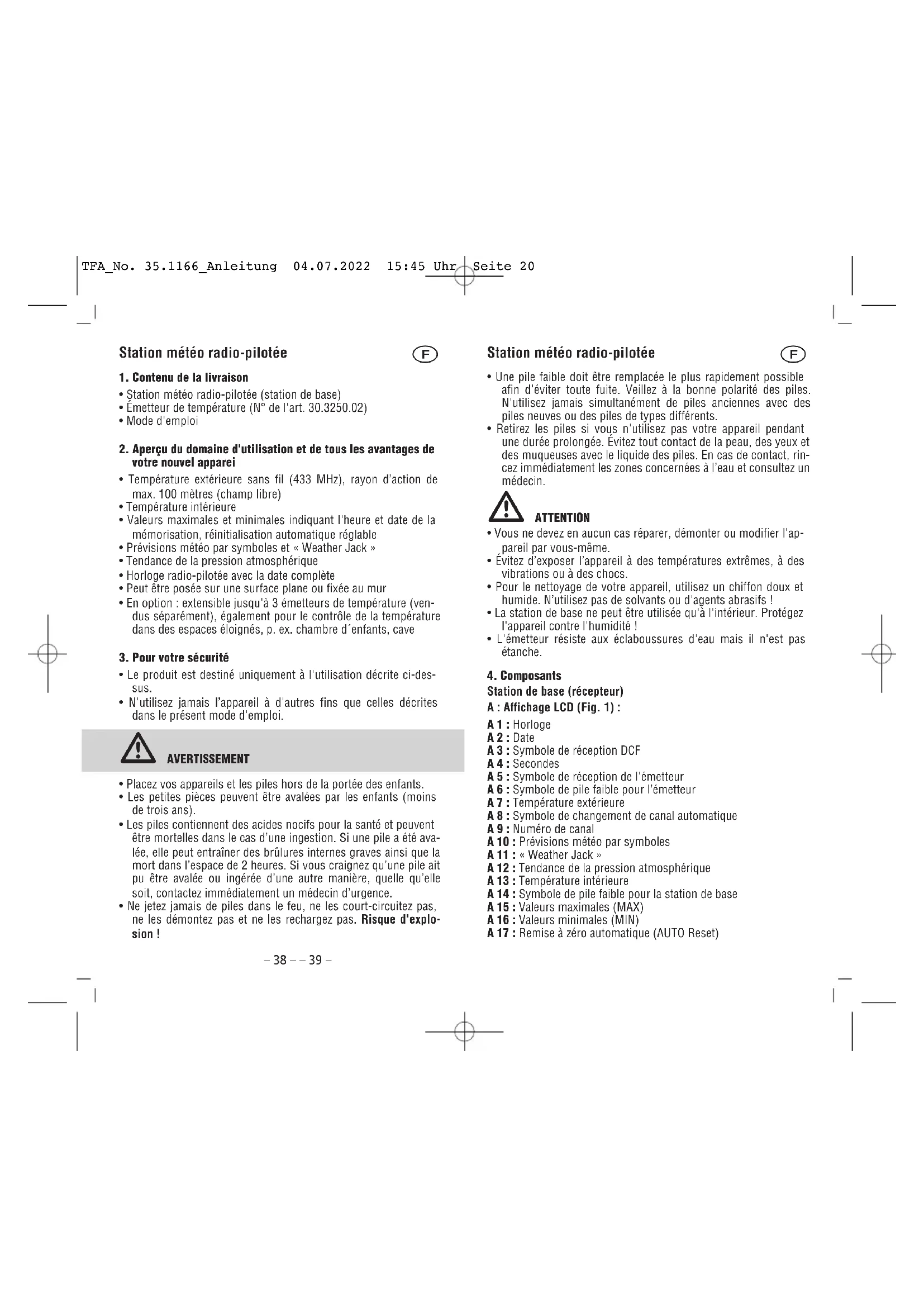 Affichage LCD (Fig. 1): A1: Horloge A2: Date A3: Symbole de réception DCF A4: Secondes A5: Symbole de réception de l'émetteur A6: Symbole de pile faible pour l'émetteur A7: Température extérieure A8: Symbole de changement de canal automatique A9: Numéro de canal A10: Prévisions météo par symboles A11: «Weather Jack » A12: Tendance de la pression atmosphérique A13: Température intérieure A14: Symbole de pile faible pour la station de base A15: Valeurs maximales (MAX) A16: Valeurs minimales (MIN) A17: Remise à zéro automatique (AUTO Reset)