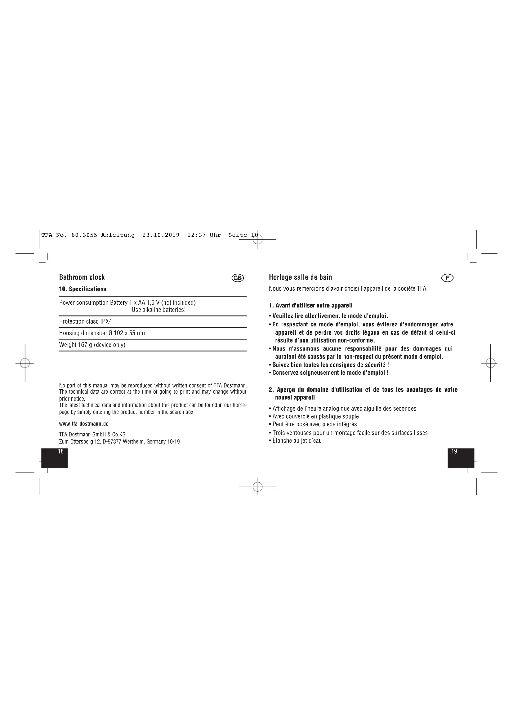 La reproduction, même partielle, du présent mode d'emploi est strictement interdite sans l'accord explicite de TFA Dostmann. Les caractéristiques techniques de ce produit ont été actualisées au moment de l'impression et peuvent être modifiées sans avis préalable. Les dernières données techniques et les informations concernant votre pro- duit peuvent être consultées en entrant le numéro de l'article sur notre site Internet. www.tfa-dostmann.de TFA Dostmann GmbH & Co.KG Zum Ottersberg 12, D-97877 Wertheim, Allemagne 10/19 TFA_No. 60.3055_Anleitung 23.10.2019 12:37 Uhr Seite 132726 Orologio da bagno