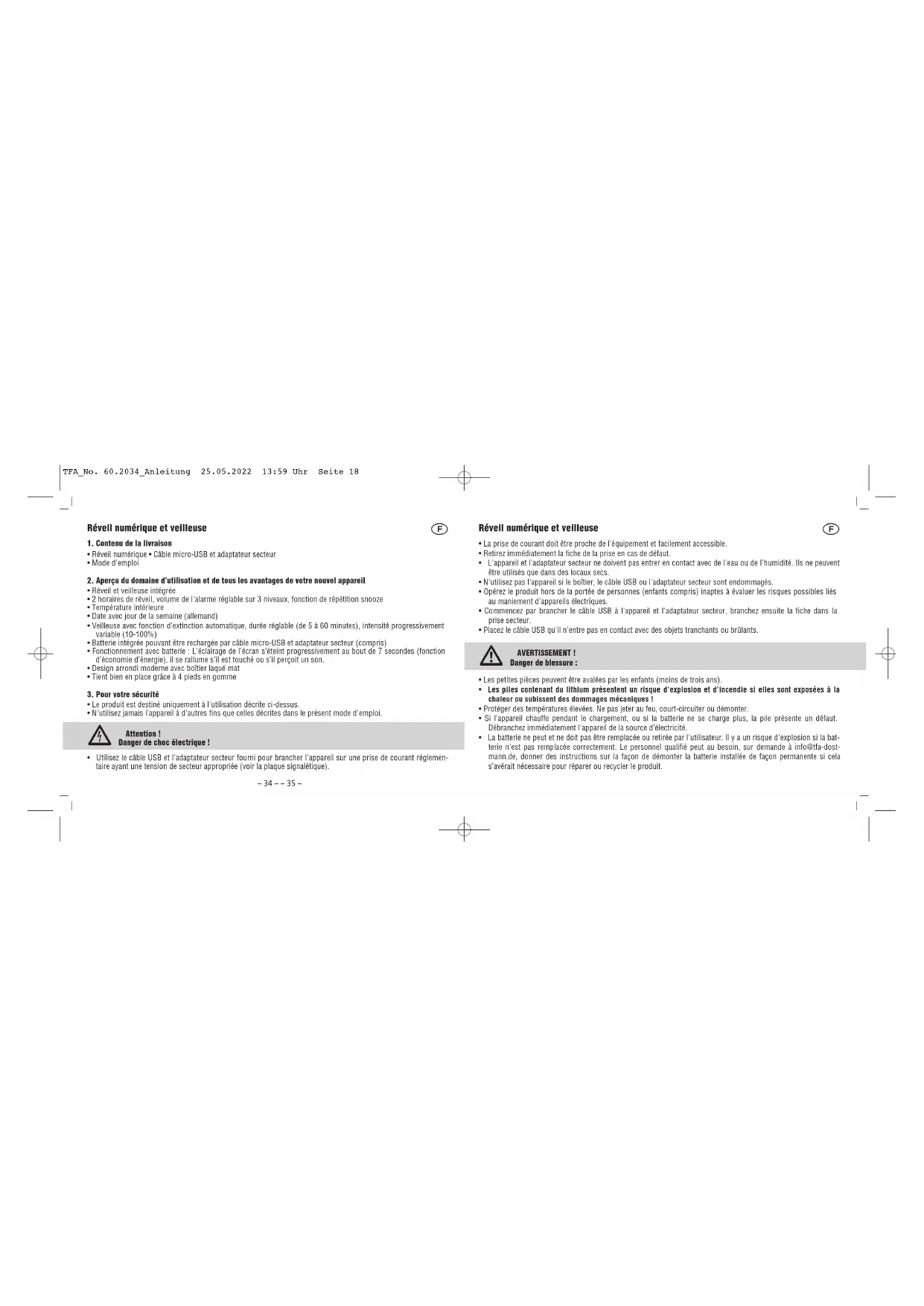 - La batterie ne peut et ne doit pas être remplacée ou retirée par l'utilisateur. Il y a un risque d'explosion si la bat- terie n'est pas remplacée correctement. Le personnel qualifié peut au besoin, sur demande à info@tfa-dost- mann.de, donner des instructions sur la façon de démonter la batterie installée de façon permanente si cela s’avérait nécessaire pour réparer ou recycler le produit. TFA_No. 60.2034_Anleitung 25.05.2022 13:59 Uhr Seite 18– 36 – – 37 – Réveil numérique et veilleuse
