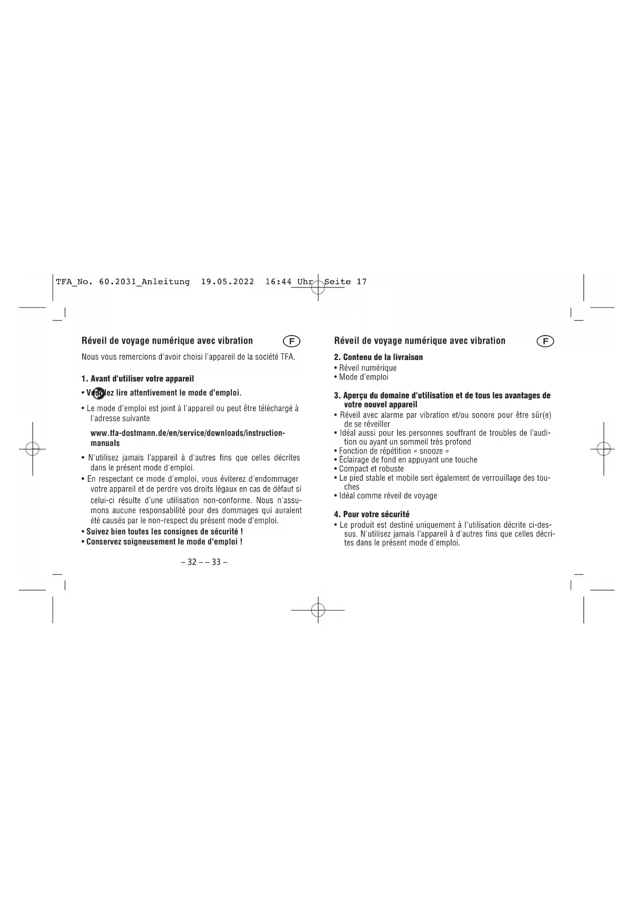 - Le produit est destiné uniquement à l'utilisation décrite ci-des- sus. N'utilisez jamais l’appareil à d'autres fins que celles décri- tes dans le présent mode d'emploi. TFA_No. 60.2031_Anleitung 19.05.2022 16:44 Uhr Seite 17– 34 – – 35 – Réveil de voyage numérique avec vibration