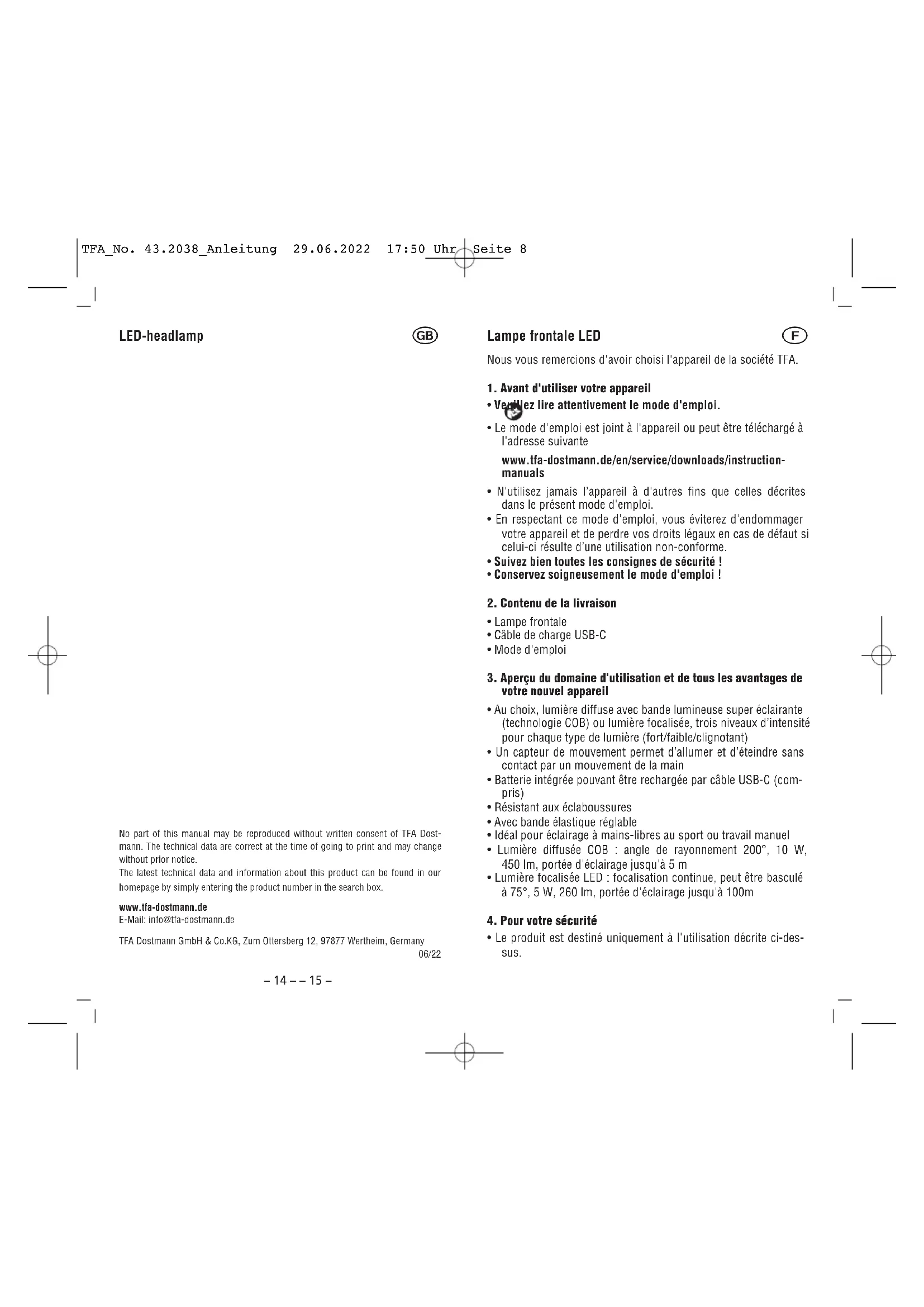 - Le produit est destiné uniquement à l'utilisation décrite ci-des- sus. TFA_No. 43.2038_Anleitung 29.06.2022 17:50 Uhr Seite 8– 16 – – 17 – Lampe frontale LED