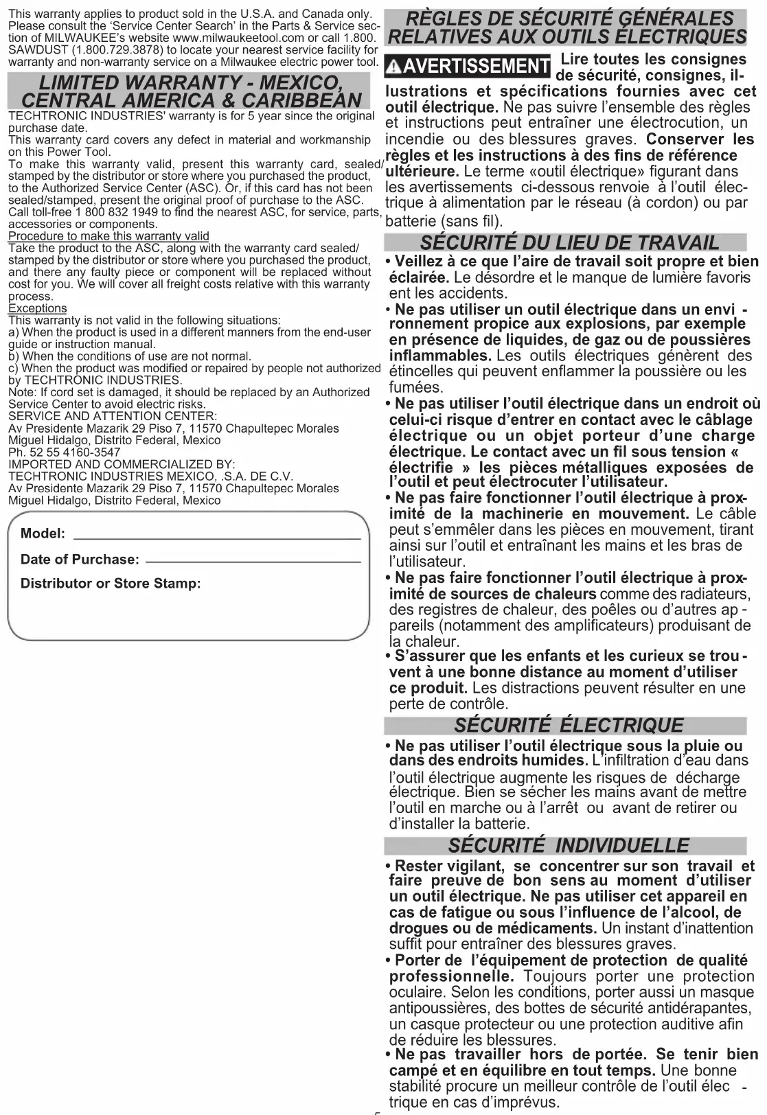 TECHTRONIC INDUSTRIES' garantit le produit pendant cinq ans à partir de la date d’achat d’origine. Le présent bon de garantie couvre tous les vices de matériau et de fabrication que peut afcher cet outil électrique. Pour assurer la validité de la présente garantie, veuillez présenter le bon de commande, estampillé du sceau du distributeur ou du magasin où le produit a été acheté, au centre de réparations agréé. Si le bon de commande n’a pas été estampillé, veuillez fournir la preuve d’achat d’origine au centre de réparations agréé. Pour un entretien, des pièces, des accessoires ou d’autres composants, composer sans frais le 1-800-832-1949 an d’obtenir les coordonnées du centre de réparations agréé le plus près. Procédure pour assurer la validité de la garantie9 Présenter le produit au centre de réparations agréé, accompagné du bon de commande estampillé du sceau du distributeur ou du magasin où le produit a été acheté. Toute pièce défectueuse ou tout composant défectueux sera remplacé sans frais. Milwaukee assume tous les frais de transport liés à ce processus de garantie. Exceptions La garantie ne s’applique pas dans les situations suivantes : a) Si le produit a été utilisé pour une n autre que celle indiquée dans le guide de l’utilisateur nal ou le manuel d’instructions. b) Si les conditions d’utilisations ne sont pas habituelles. c) Si le produit a été modié ou réparé par une personne non autorisée par TECHTRONIC INDUSTRIES. Note : Si le cordon électrique est endommagé, il doit être remplacé par un centre de réparations agréé pour éviter les risques d’électrocution. CENTRE DE RÉPARATIONS ET DE SERVICE: Av Presidente Mazarik 29 Piso 7, 11570 Chapultepec Morales Miguel Hidalgo, Distrito Federal, Mexico Ph. 52 55 4160-3547 IMPORTÉ ET COMMERCIALISÉ PAR : TECHTRONIC INDUSTRIES MEXICO, .S.A. DE C.V. Av Presidente Mazarik 29 Piso 7, 11570 Chapultepec Morales Miguel Hidalgo, Distrito Federal, Mexico Modèle : Date d’achat : Sceau du distributeur ou du magasin :