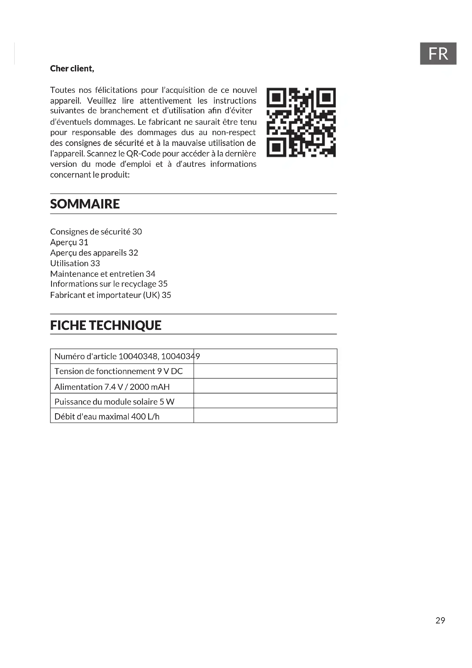 Cher client, Toutes nos félicitations pour l’acquisition de ce nouvel appareil. Veuillez lire attentivement les instructions suivantes de branchement et d’utilisation an d’éviter d’éventuels dommages. Le fabricant ne saurait être tenu pour responsable des dommages dus au non-respect des consignes de sécurité et à la mauvaise utilisation de l’appareil. Scannez le QR-Code pour accéder à la dernière version du mode d‘emploi et à d‘autres informations concernant le produit: SOMMAIRE Consignes de sécurité 30 Aperçu 31 Aperçu des appareils 32 Utilisation 33 Maintenance et entretien 34 Informations sur le recyclage 35 Fabricant et importateur (UK) 35 FICHE TECHNIQUE Numéro d'article 10040348, 10040349 Tension de fonctionnement 9 V DC Alimentation 7.4 V / 2000 mAH Puissance du module solaire 5 W Débit d'eau maximal 400 L/h30