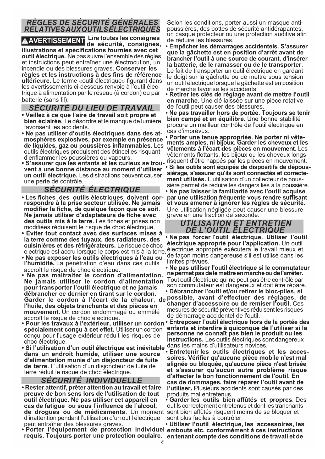 - Entretenir les outils électriques et les accessoires. Vérifier qu'aucune pièce mobile n'est mal alignée ou bloquée, qu'aucune pièce n'est brisée et s'assurer qu'aucun autre problème risque d'affecte ûtés et propres. Des outils correctement entretenus et dont les tranchants sont bien affûtés risquent moins de se bloquer et sont plus faciles à contrôler.