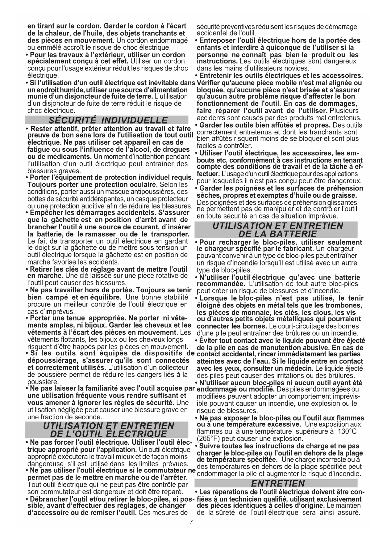 - Suivre toutes les instructions de charge et ne pas charger le bloc-piles ou l’outil en dehors de la plage de température spéciée. Une charge incorrecte ou à des températures en dehors de la plage spéciée peut endommager la pile et augmenter le risque d’incendie. ENTRETIEN