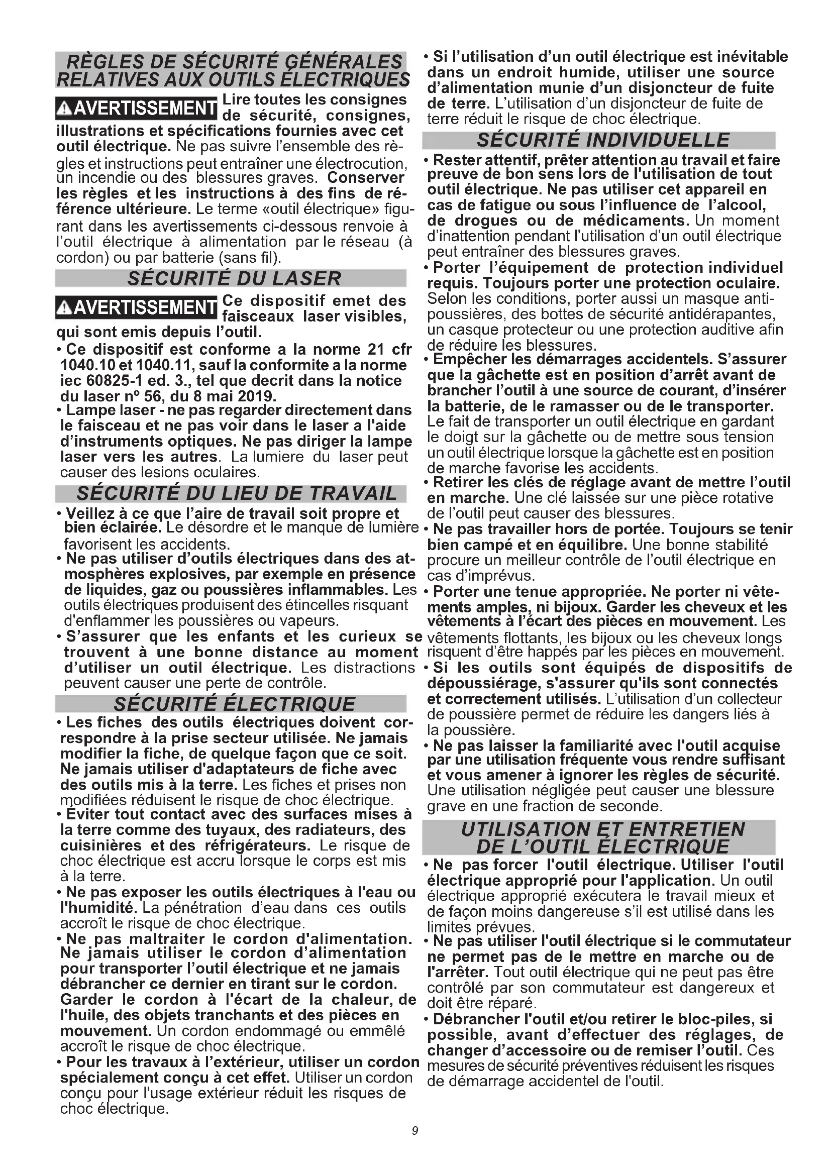 AVERTISSEMENT Lire toutes les consignes de sécurité, consignes, illustrations et spécications fournies avec cet outil électrique. Ne pas suivre l’ensemble des rè- gles et instructions peut entraîner une électrocution, un incendie ou des blessures graves. Conserver les règles et les instructions à des ns de ré- férence ultérieure. Le terme «outil électrique» gu- rant dans les avertissements ci-dessous renvoie à l’outil électrique à alimentation par le réseau (à cordon) ou par batterie (sans l).