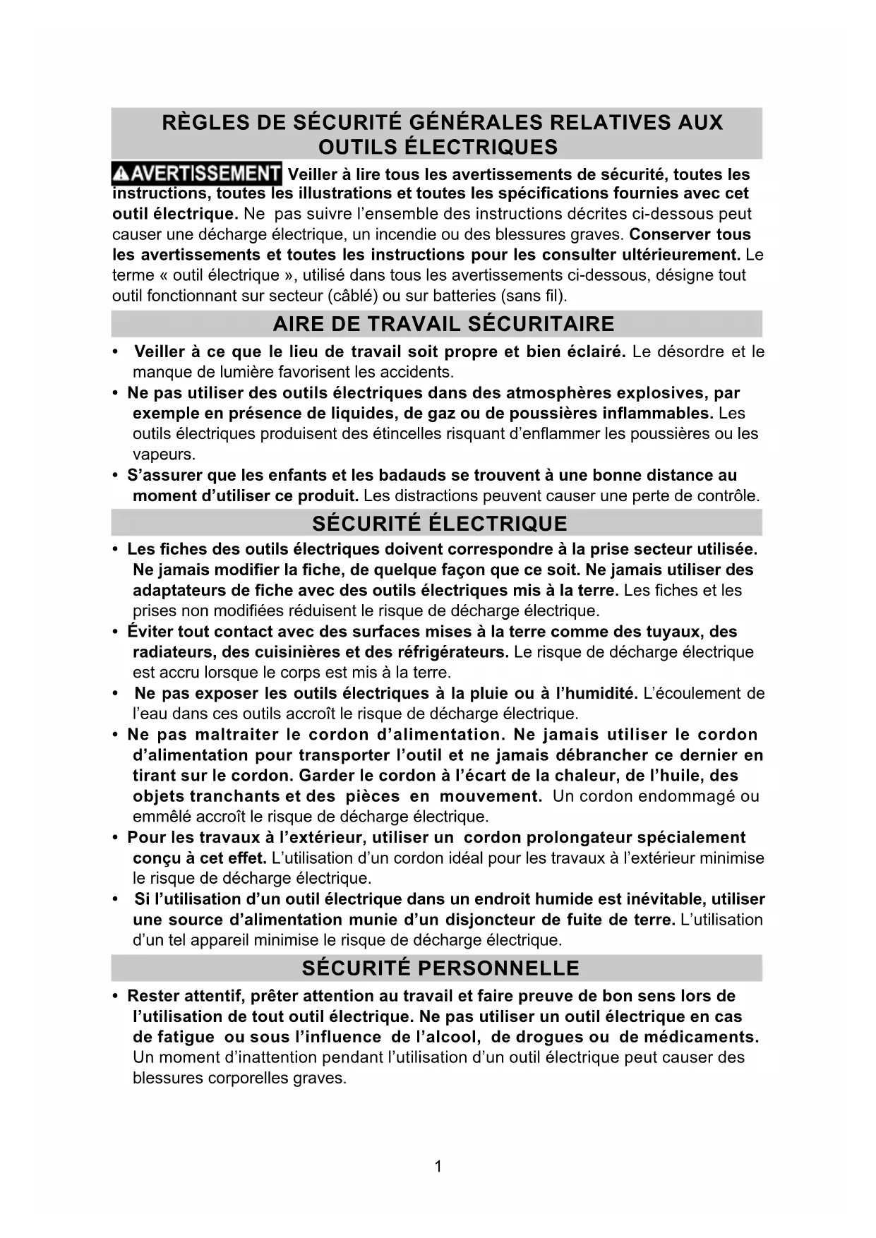 - Rester attentif, prêter attention au travail et faire preuve de bon sens lors de l’utilisation de tout outil électrique. Ne pas utiliser un outil électrique en cas de fatigue ou sous l’influence de l’alcool, de drogues ou de médicaments. Un moment d’inattention pendant l’utilisation d’un outil électrique peut causer des blessures corporelles graves.2