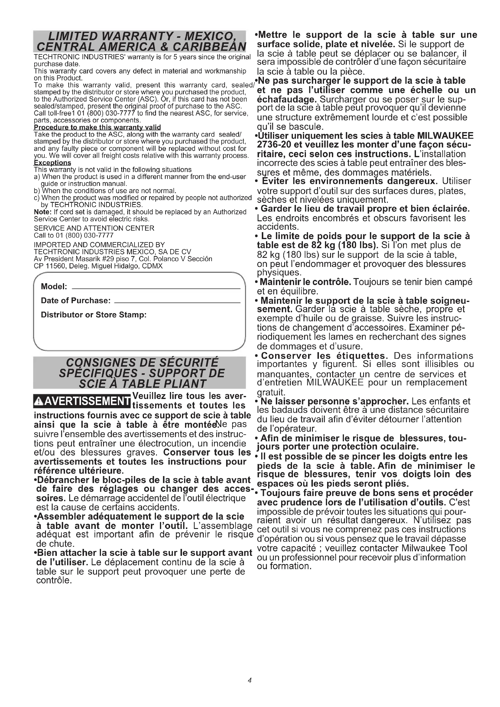 - Conserve el control. Mantenga una posición se- gura y equilibrada adecuada en todo momento. Usure normale : Plusieurs outils électriques requièrent un rem- placement et un entretien périodique de leurs pièces pour un meilleur rendement. Cette garantie ne couvre pas la répara- tion des pièces due à l’utilisation normale de l’outil, y compris, mais sans s’y limiter, les mandrins, les brosses, les cordes, les sabots de scie, les portes-lames, les joints toriques, les joints, les amortisseurs, les lames d’entraînement, les pistons, les per- cuteurs, les crochets et les rondelles à couvercle amortisseur. *Cette garantie ne s’applique pas aux cloueuses-agrafeuses pneumatiques, aux pulvérisateurs à peinture sans air, aux blocs- piles pour outils sans l, aux génératrices d’alimentation portatives à essence, aux outils à main, aux monte-charges – électriques, à levier et à chaîne (manuels), aux vestes chauffantes M12™, aux produits réusinés, ni aux produits d’essai et de mesure. Il existe des garanties séparées distinctes pour ces produits. **La période de garantie applicable pour les radios de chantier, le port d’alimentation M12™, la source électrique M18™, le ventilateur de chantier et les chariots de travail industriels Trade Titan™ est d’une du- rée d’un (1) an à compter de la date d’achat. La période de garantie des câbles de nettoyage des canalisations est de deux (2) ans à compter de la date d’achat. La période de garantie couvrant la DEL de la lampe de travail à DEL et l’ampoule améliorée à DEL de la lampe de travail est une garantie à vie du produit soumise aux limitations ci-dessus. En cas de défaillance de la DEL ou de l’ampoule à DEL pendant son utilisation normale, la pièce défaillante sera remplacée gratuitement. L’enregistrement de la garantie n’est pas nécessaire pour bénécier de la garantie en vigueur sur un outil électrique MILWAUKEE. La date de fabrication du produit servira à établir la période de garantie si aucune preuve d’achat n’est fournie lorsqu’une demande de service sous garantie est déposée. L’ACCEPTATION DES RECOURS EXCLUSIFS DE RÉPARATION ET DE REMPLACEMENT DÉCRITS DANS LES PRÉSENTES EST UNE CONDITION DU CONTRAT D’ACHAT DE TOUT PRODUIT MILWAU- KEE. SI VOUS N’ACCEPTEZ PAS CETTE CONDITION, VOUS NE DEVEZ PAS ACHETER LE PRODUIT. EN AUCUN CAS, MILWAUKEE NE SAURAIT ÊTRE RESPONSABLE DE TOUT DOMMAGE AC- CESSOIRE, SPÉCIAL OU INDIRECT, DE DOMMAGES-INTÉRÊTS PUNITIFS OU DE TOUTE DÉPENSE, D’HONORAIRES D’AVOCATS, DE FRAIS, DE PERTE OU DE DÉLAIS ACCESSOIRES À TOUT DOMMAGE, DÉFAILLANCE OU DÉFAUT DE TOUT PRODUIT, Y COMPRIS NOTAMMENT LES PERTES DE PROFIT. CERTAINS ÉTATS ET PROVINCES NE PERMETTANT PAS L'EXCLUSION OU LA LIMITATION DES DOMMAGES DIRECTS OU INDIRECTS, LES RESTRICTIONS CI-DESSUS PEUVENT DONC NE PAS VOUS ÊTRE APPLICABLES. CETTE GARANTIE EST EXCLUSIVE ET REMPLACE TOUTE AUTRE GARANTIE EXPRESSE, QU’ELLE SOIT VERBALE OU ÉCRITE. DANS LA MESURE PERMISE PAR LA LOI. MILWAUKEE RENONCE À TOUTE GARANTIE IMPLICITE, Y COMPRIS, MAIS SANS S’Y LIMITER, TOUTE GARANTIE IMPLICITE DE QUALITÉ MARCHANDE OU D’ADAPTATION À UNE UTILISA- TION OU À UNE FIN PARTICULIÈRE. DANS LA MESURE OÙ UNE TELLE STIPULATION D’EXONÉRATION N’EST PAS PERMISE PAR LA LOI, LA DURÉE DE CES GARANTIES IMPLICITES EST LIMITÉE À LA PÉRIODE APPLICABLE DE LA GARANTIE EXPRESSE, TEL QUE CELA EST DÉCRIT PRÉCÉDEMMENT. CERTAINS ÉTATS ET PROVINCES NE PERMETTANT PAS DE LIMITATION DE DURÉE DES GARANTIES IMPLICITES, LES RESTRICTIONS CI- DESSUS PEUVENT DONC NE PAS VOUS ÊTRE APPLICABLES. LA PRÉSEN- TE VOUS CONFÈRE DES DROITS LÉGAUX PARTICULIERS; VOUS BÉNÉFICIEZ ÉGALEMENT D’AUTRES DROITS QUI VARIENT D’UN ÉTAT À UN AUTRE. Cette garantie s’applique aux produits vendus aux États-Unis et au Canada uniquement. Veuillez consulter la rubrique Centre SAV Milwaukee, dans la section Pièces et Services du site Web de MILWAUKEE, à l’adresse www.milwaukeetool.com, ou composer le 1-800-SAWDUST (1-800-729-3878) an de trouver le centre de service de votre région le plus proche pour l’entretien, sous garantie ou non, de votre outil électrique Milwaukee. GARANTIE LIMITÉE – MEXIQUE,