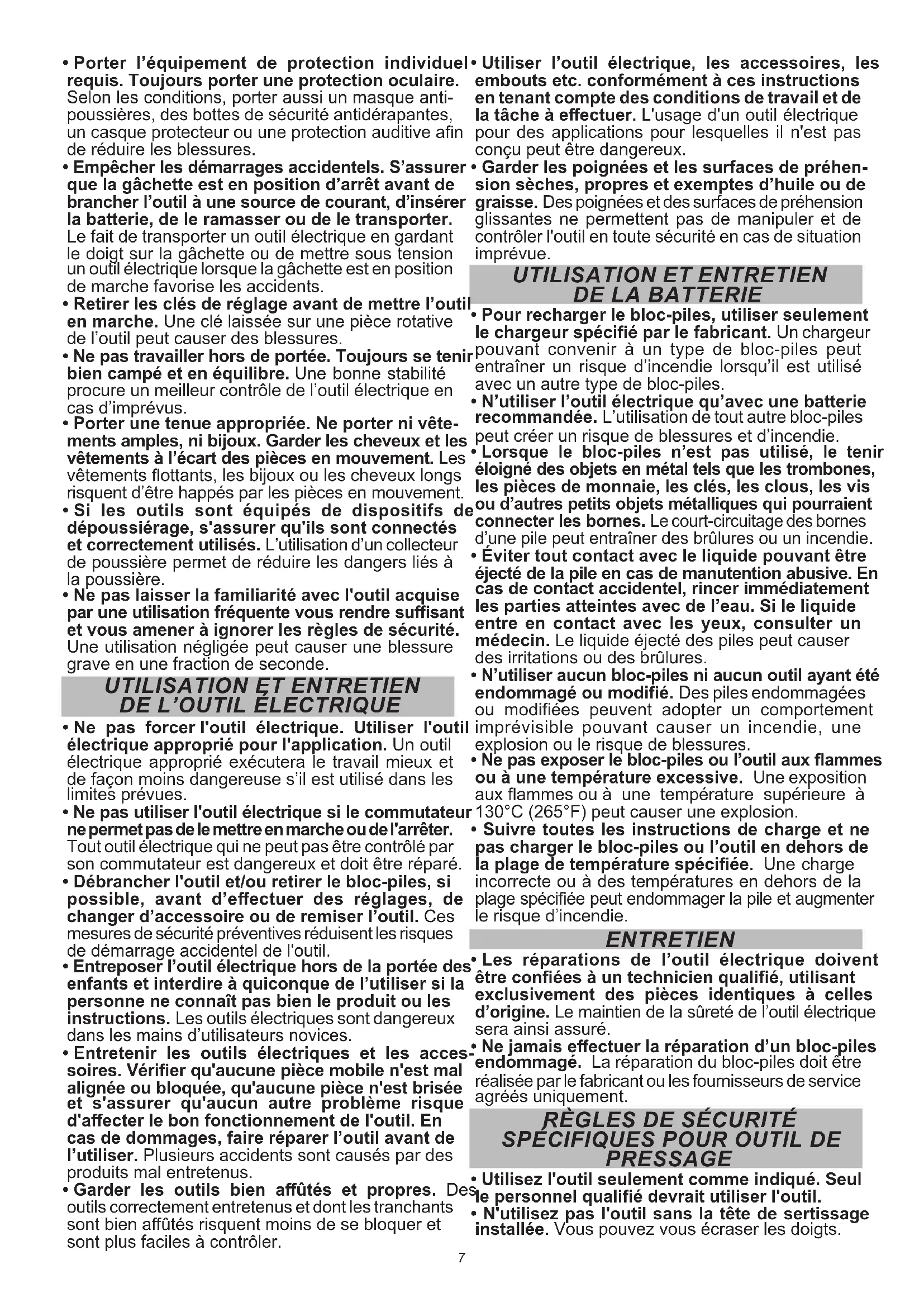 - Suivre toutes les instructions de charge et ne pas charger le bloc-piles ou l’outil en dehors de la plage de température spéciée. Une charge incorrecte ou à des températures en dehors de la plage spéciée peut endommager la pile et augmenter le risque d’incendie. ENTRETIEN