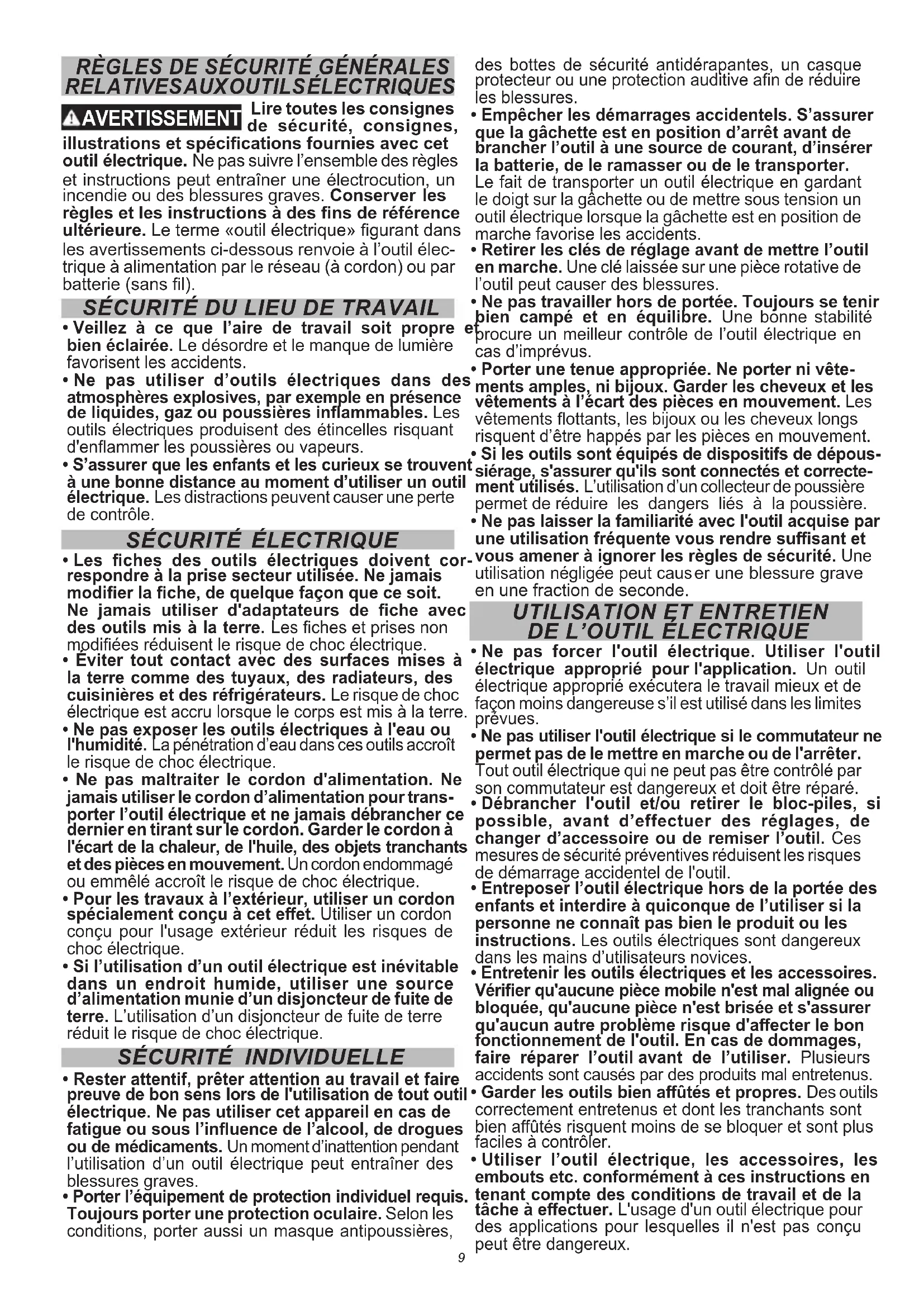 - Entretenir les outils électriques et les accessoires. Vérier qu'aucune pièce mobile n'est mal alignée ou bloquée, qu'aucune pièce n'est brisée et s'assurer qu'aucun autre problème risque d'aecter le bon fonctionnement de l'outil. En cas de dommages, faire réparer l’outil avant de l’utiliser. Plusieurs accidents sont causés par des produits mal entretenus.