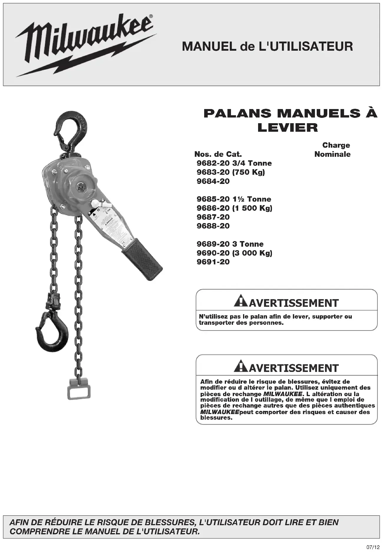SÉCURITÉ3 No. de Tonnes Levage Catalogue (Kg) Pi. (m) 9682-20 3/4 (750) 5 (1,5)9691-20 3 (3 000) 20 (6,1)9689-20 3 (3 000) 5 (1,5)9686-20 1½ (1 500) 10 (3,0)9687-20 1½ (1 500) 20 (6,1)9688-20 1½ (1 500) 25 (7,6)9685-20 1½ (1 500) 5 (1,5)9684-20 3/4 (750) 20 (6,1)9683-20 3/4 (750) 10 (3,0)9690-20 3 (3 000) 10 (3,0) Chaque palan manuel à levier MILWAUKEE est fabriqué conformément aux devis spécifiés dans le présent manuel et selon notre interprétation des sections du code B30.21 “Manually Lever Operated Hoists” ( «Palans manuels á levier») de l’American Society of Mechanical Engineers (ASME), de même que selon les normes de lOccupational Safety and Health Act (OSHA) en vigueur au moment de la fabrication. Copies de ces normes peuvent être obtenues de l’ASME Order Department, 22 Law