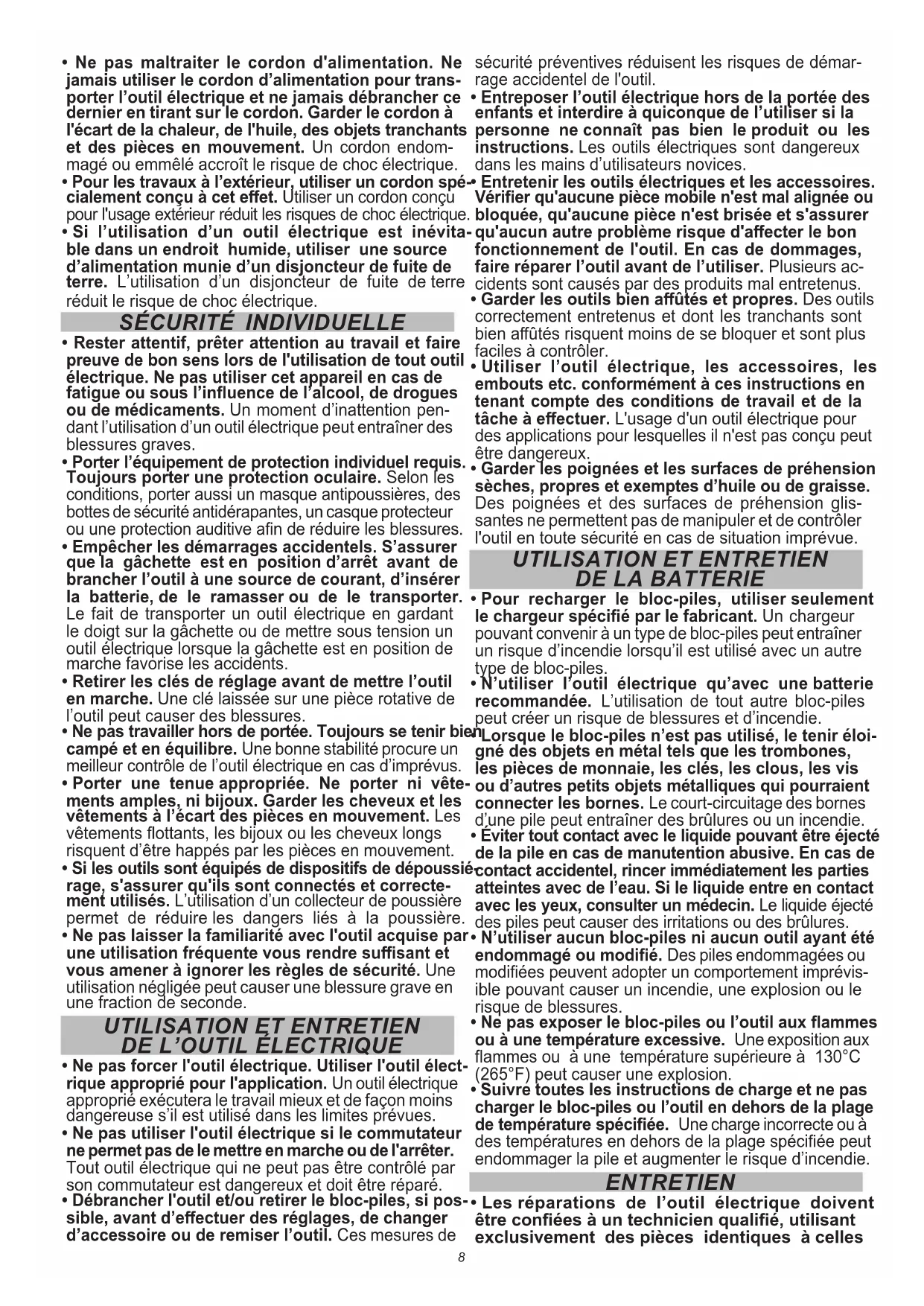 - Suivre toutes les instructions de charge et ne pas charger le bloc-piles ou l’outil en dehors de la plage de température spéciée. Une charge incorrecte ou à des températures en dehors de la plage spéciée peut endommager la pile et augmenter le risque d’incendie. ENTRETIEN