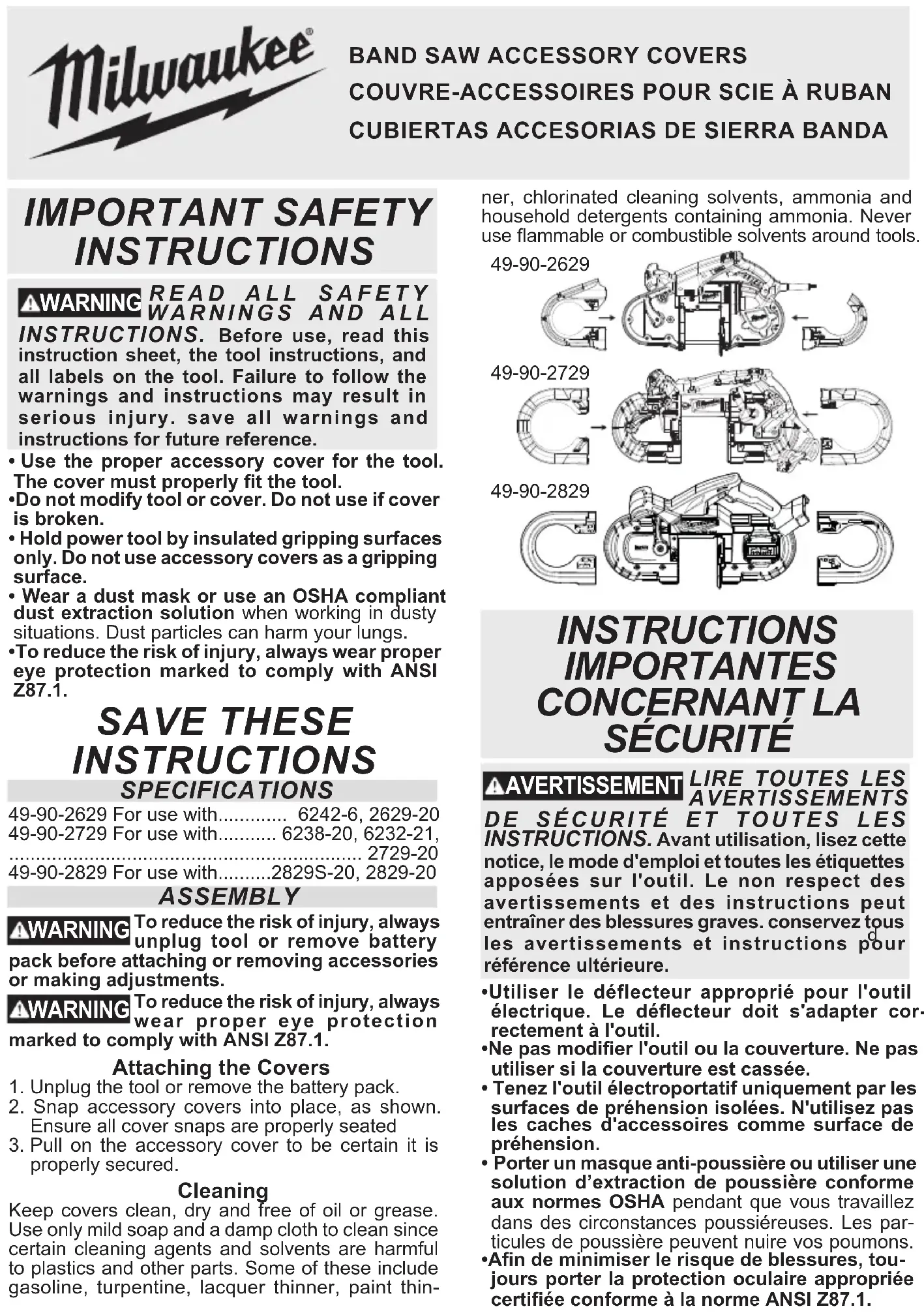 - An de minimiser le risque de blessures, tou- jours porter la protection oculaire appropriée certiée conforme à la norme ANSI Z87.1.58220181d3 961013545-03(B) 10/19 Printed in China MILWAUKEE TOOL 13135 West Lisbon Road Brookeld, WI 53005 USA CONSERVER CES INSTRUCTIONS SPECIFICATIONS 49-90-2629 Pour une utilisation avec .......... 6242-6, .................................................................... 2629-20 49-90-2729 Pour une utilisation avec ........ 6238-20, ..................................................... 6232-21, 2729-20 49-90-2829 Pour une utilisation avec ........ 2829-20, .................................................................. 2829S-20 MONTAGE AVERTISSEMENT Pour réduire les risques de blessure, débranchez tou- jours l'outil ou retirez le module batterie avant de xer ou de retirer des accessoires ou d'eectuer des réglages. AVERTISSEMENT An de minimiser le risque de blessures, toujours porter la protection oculaire appropriée certiée conforme à la norme ANSI Z87.1. Fixation des couvertures